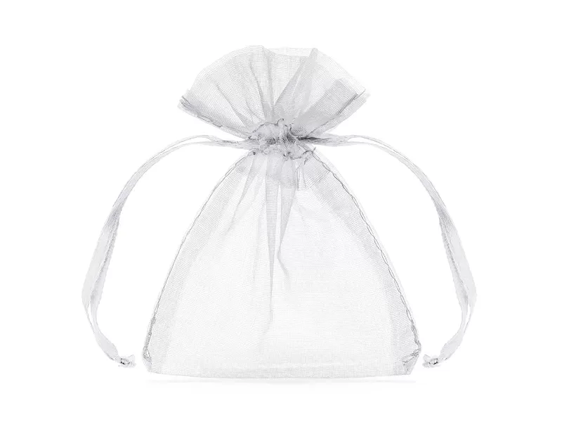 Sťahovacie organzové vrecúška v bielej farbe, ideálne na drobné darčeky pre hostí na párty alebo svadbu. Možno ich tiež použiť ako dekoráciu, kedy ich naplníte napríklad kamienkami alebo umelými diamantmi a rozmiestnite po stoloch.