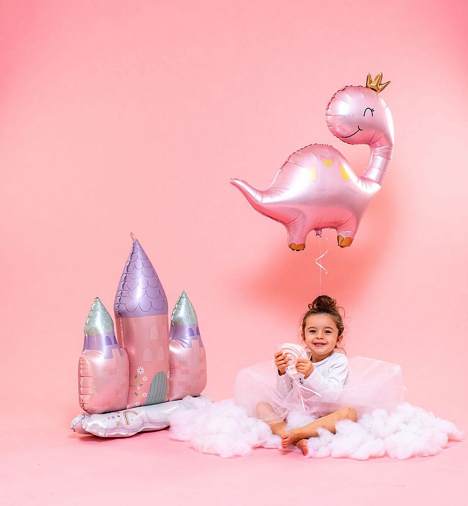 Ružový fóliový balónik v tvare dinosaura s korunkou a srdiečkami na chrbte. Tento dinosaurus s úsmevom je dôkazom, že nie každý veľký tvor musí vyzerať hrozivo.