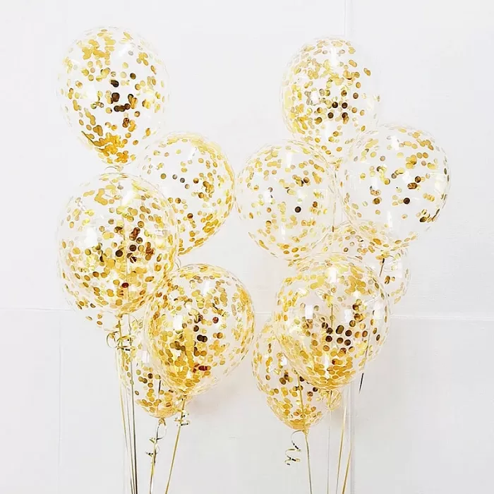 Popis: Latexové balóniky priehľadné so zlatými konfetami 30 cm - 5 ks