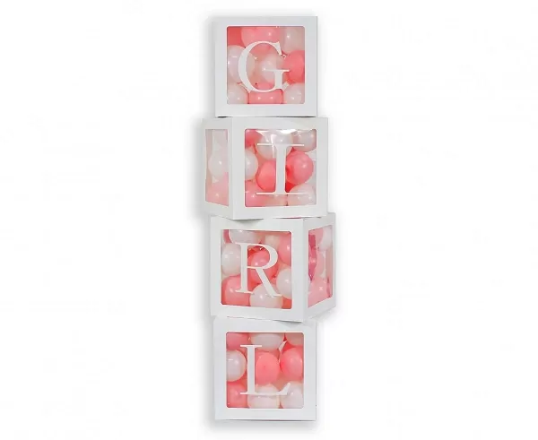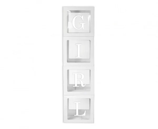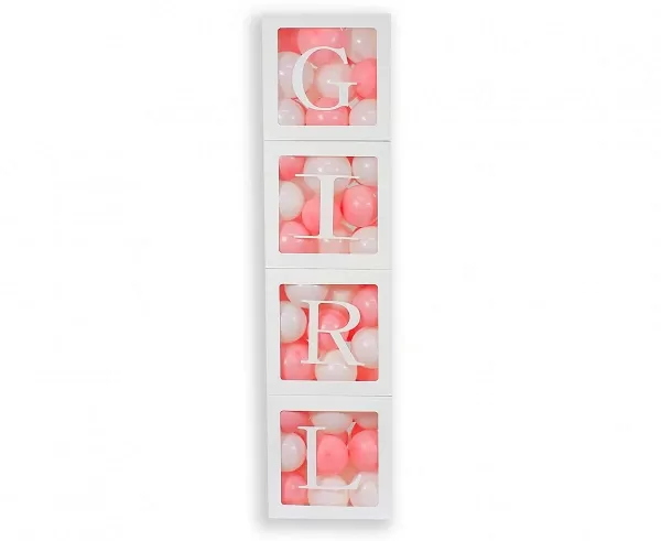 Krabice s nápisom GIRL - (dodávaný v balení a je len potrebné prirobiť, lepenie je súčasťou balenia), ktoré sú ideálne na dekoráciu Baby Shower párty - odhalenie pohlavia bábätka.