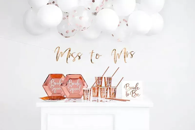 Papierový banner v rosegold farbe a nápisom Miss to Mrs, zo slečny na pani, bude perfektným jednoduchým a elegatným doplnkom na vašej rozlúčke so slobodou.