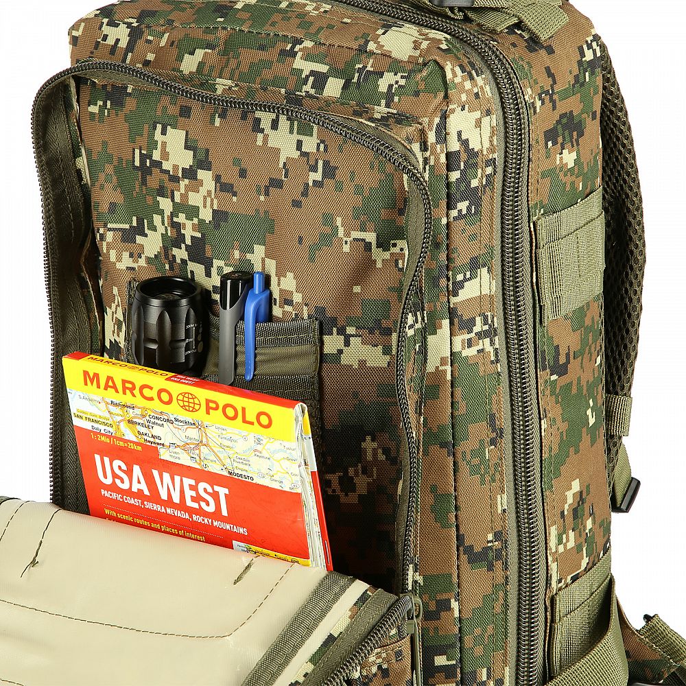 Model Defender má celkom 4 komory s celkovým objemom 30 litrov. Všetky komory sú opatrené dvojcestným zipsom. Hlavná komora má zips po takmer celom obvode a je možné ju úplne otvoriť pre pohodlný prístup, veko komory je opatrené sieťovinovým vreckom, do ktorého sa zmestí napríklad tablet. Prostredná komora obsahuje hlavný priestor napríklad pre dokumenty a mapu, na stene komory sú ďalej 2 vrecká napríklad pre ceruzky, perá, buzolu alebo svietidlo. Predná, horná komora je určená na menšie predmety ako je napríklad powerbanka, alebo mobilný telefón. Predná dolná komora ponúka okrem hlavného priestoru aj ďalší rad kapsičiek na drobnosti. Na zadnej strane sa nachádza ešte jedno ploché vrecko na suchý zips.