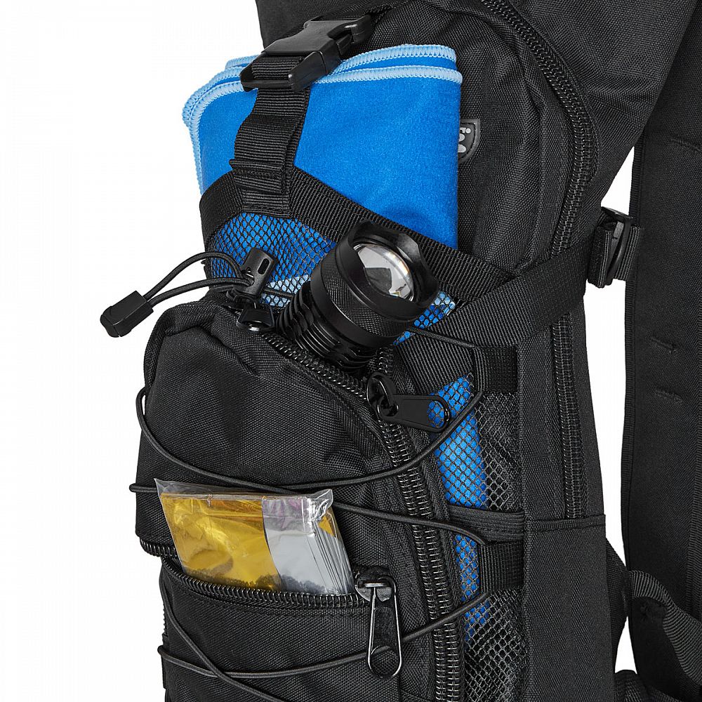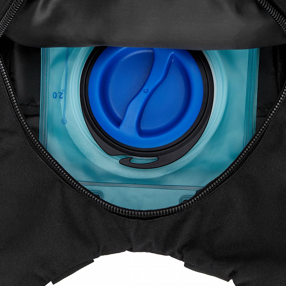 Hlavná komora batohu je opatrená prepážkou, v hornej časti sa nachádzajú 2 karabíny pre zavesenie hydrovaku (nie je súčasťou dodávky). Hadičku hydrovaku je možné vyviesť prievlakmi na pravej aj na ľavej strane pod ramennými panelmi. Na hlavnej komore sa nachádzajú ďalšie úložné priestory a to veľké sieťované vrecko s popruhom a prackou - menšie otvorené, sieťované vrecko - 2. komora na zips - vrecko na zips (napríklad pre mobilný telefón a peňaženku) a gumová šnúra s brzdičkou, pod ktorou je možné prenášať napríklad cyklistickú helmu, alebo karimatku. Po stranách batohu sa nachádzajú kompresné popruhy, ktoré sťahujú hlavnú komoru a obe sieťované vrecká. Na hornej strane je robustné ucho na pohodlné prenášanie batohu v ruke. Zadná strana a ramenné popruhy sú polyesterové bez polstrovania. Na popruhoch je gumové pútko na prevlečenie hadičky hydrovaku a hrudný popruh, ten je výškovo a dĺžkovo nastaviteľný. Bedrový popruh s robustnou prackou má šírku 3,5 centimetra.