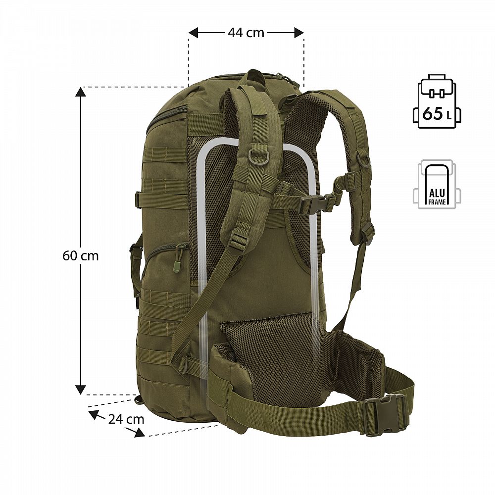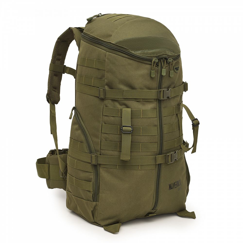 Maverick je vyrobený z pevného 100% polyesteru pokrytého PVC vrstvou, ktorá poskytuje veľmi dobrú odolnosť proti oderu, vlhkosti a intenzívnemu používaniu v náročných terénnych podmienkach. Vnútri konštrukcie sa nachádza hliníkový rám, ktorý stabilizuje batoh a zaisťuje ergonomické rozloženie hmotnosti, čím odľahčuje chrbticu a zvyšuje pohodlie pri nosení – najmä pri dlhých pochodoch s plnou výbavou.