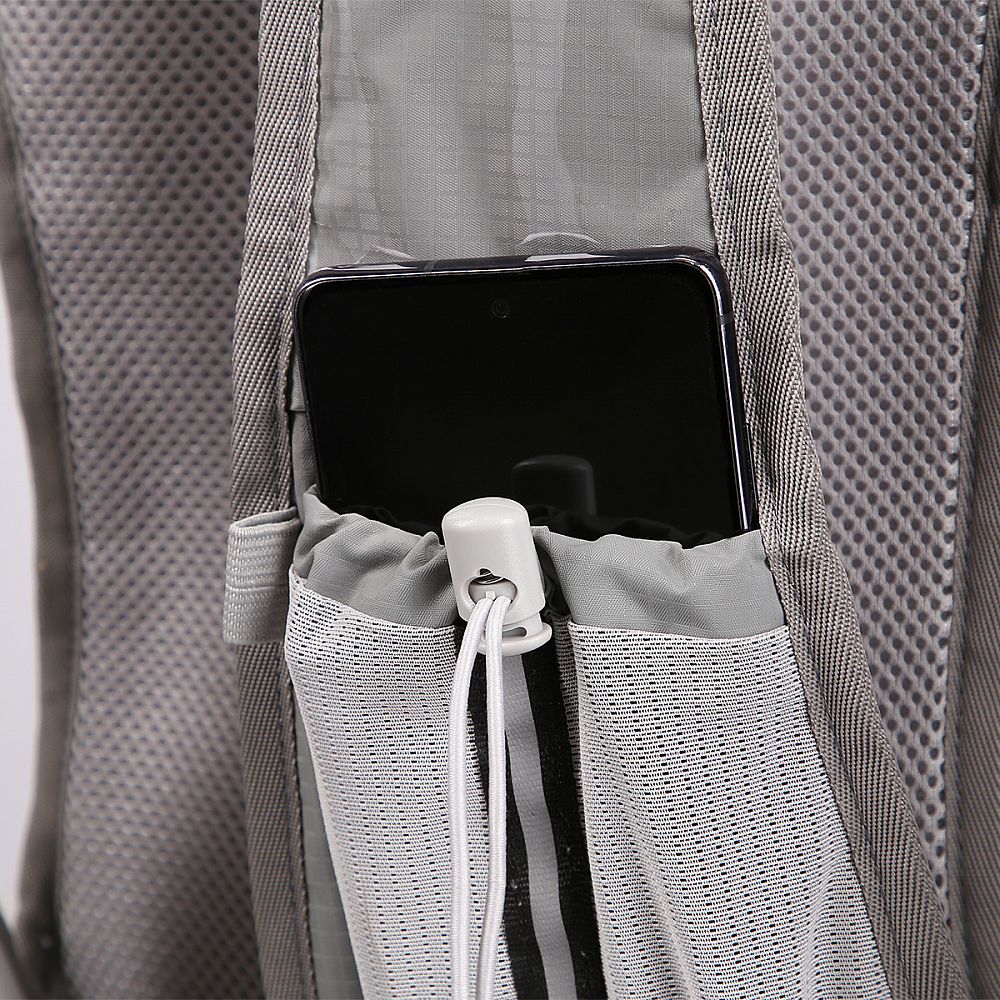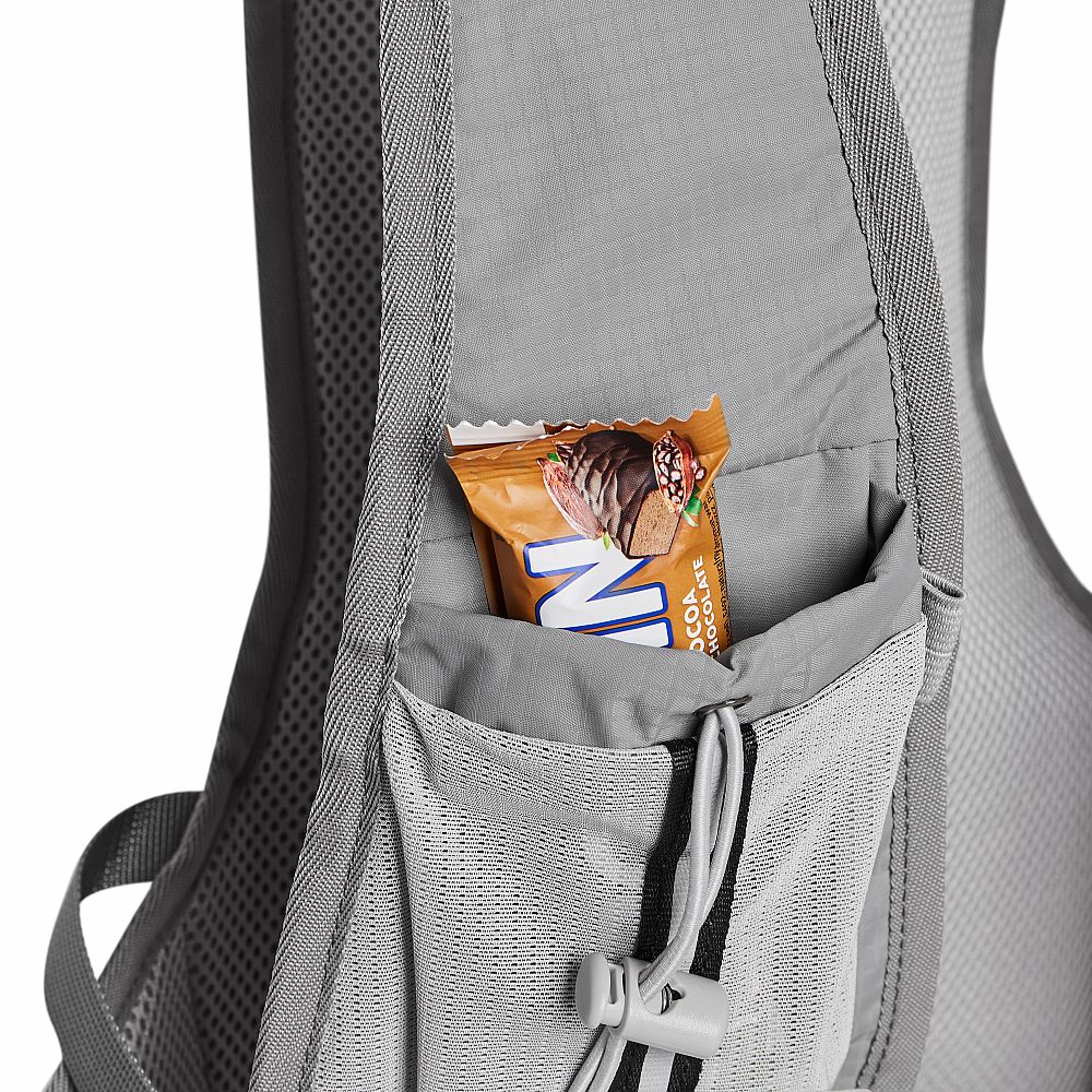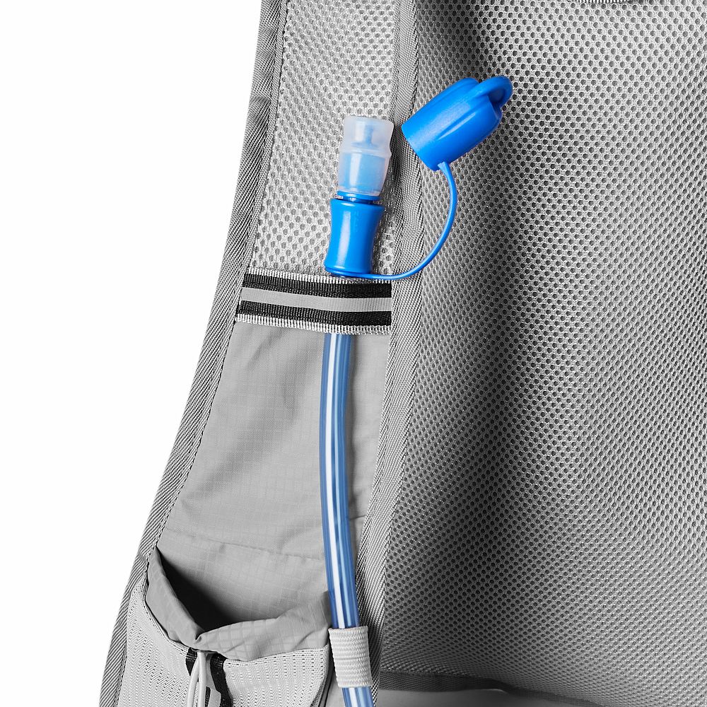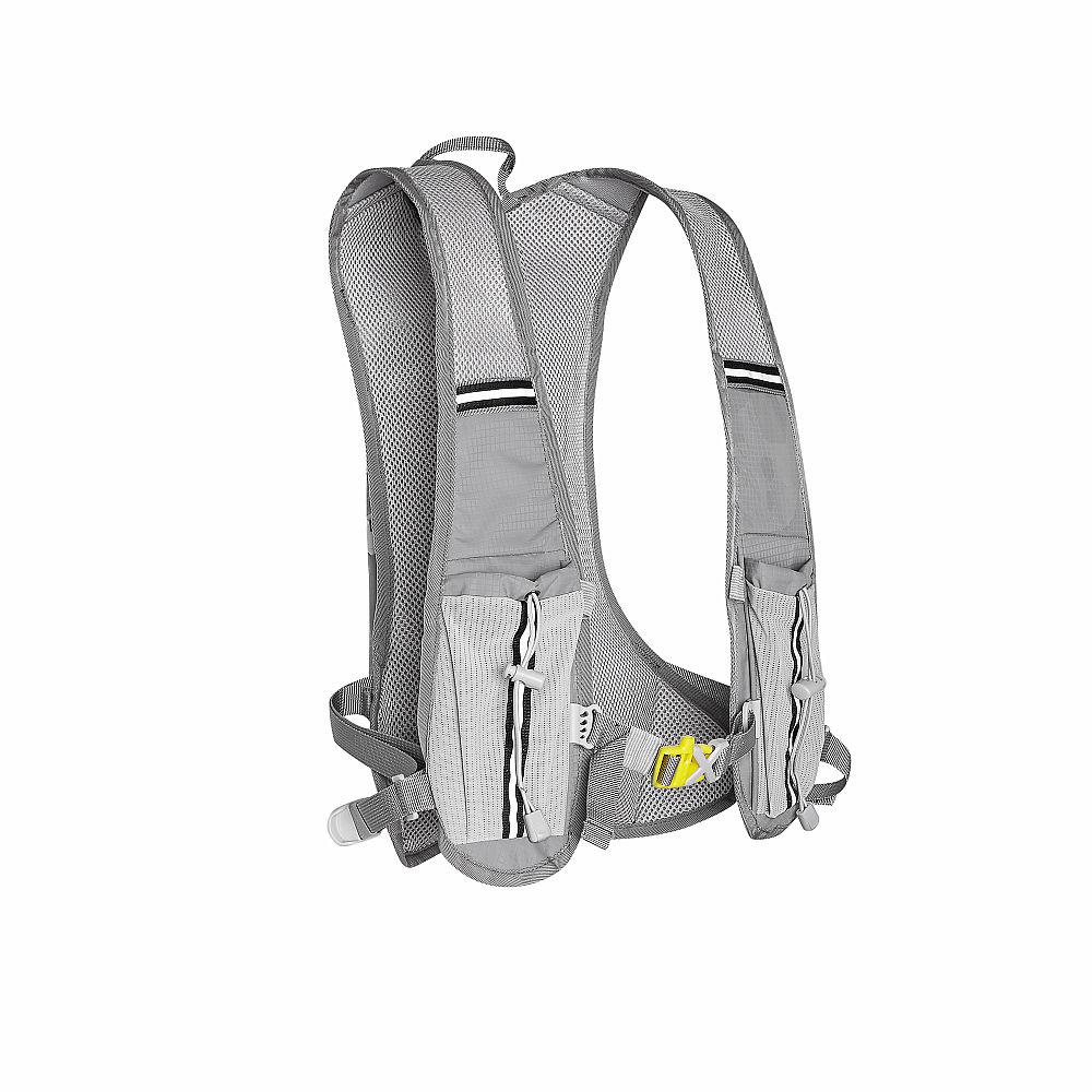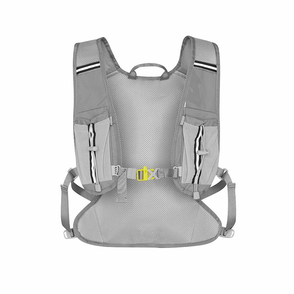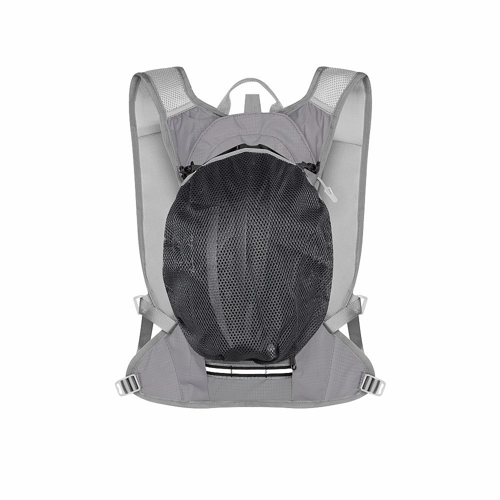 Hlavná komora batohu je vybavená prepážkou, v hornej časti sa nachádzajú 2 suché zipsy na zavesenie hydrovaku (nie je súčasťou dodávky). Zadná strana hlavnej komory je opatrená hliníkovou fóliou, ktorá slúži ako izolácia medzi hydrovakom a chrbtom, takže nápoj sa nebude ohrievať teplom od chrbta. Hadičku hydrovaku je možné vyviesť prievlakmi na pravej aj na ľavej strane pod ramennými panelmi. Predná strana batohu je opatrená gumovým lankom s brzdičkou, pod ktoré je možné uložiť napríklad karimatku. Nižšie nájdeme vrecko, v ktorom sa skrýva sieťka, ktorú je možné vytiahnuť a pomocou karabínok pripnúť k stranám batohu, sieťka následne vytvorí vrecko, čo ktoré môžeme uložiť napríklad cyklistickú helmu, ešus a pod.. Pod vreckom je reflexný panel, ku ktorému si môžeme pripnúť ďalšie vybavenie. Na pravej strane sa skrýva ďalšie vrecko na zips, ktoré je ideálne pre telefón, peňaženku, alebo napríklad kľúče. Na hornej strane batohu je pútko pre ľahké prenášanie batohu v ruke. Chrbát a ramenné popruhy sú vyrobené zo sieťoviny doplnené o priedušnú penu, ktorá zvyšuje priedušnosť panelu a chrbát sa bude menej potiť. Ramenné popruhy sú opatrené reflexnými remienkami na pretiahnutie hadičky od hydrovaku a vreckami zo sieťoviny. Na ľavom popruhu sa navyše nachádza vrecko s priehľadnou čelnou stranou, do ktorej je možné uložiť napríklad kartičku pre prípad straty, štartové číslo a podobne. Ramenné popruhy sú spojené hrudným pásom, ktorý je možné výškovo nastaviť. Popruh je spojený plastovou prackou s píšťalkou.