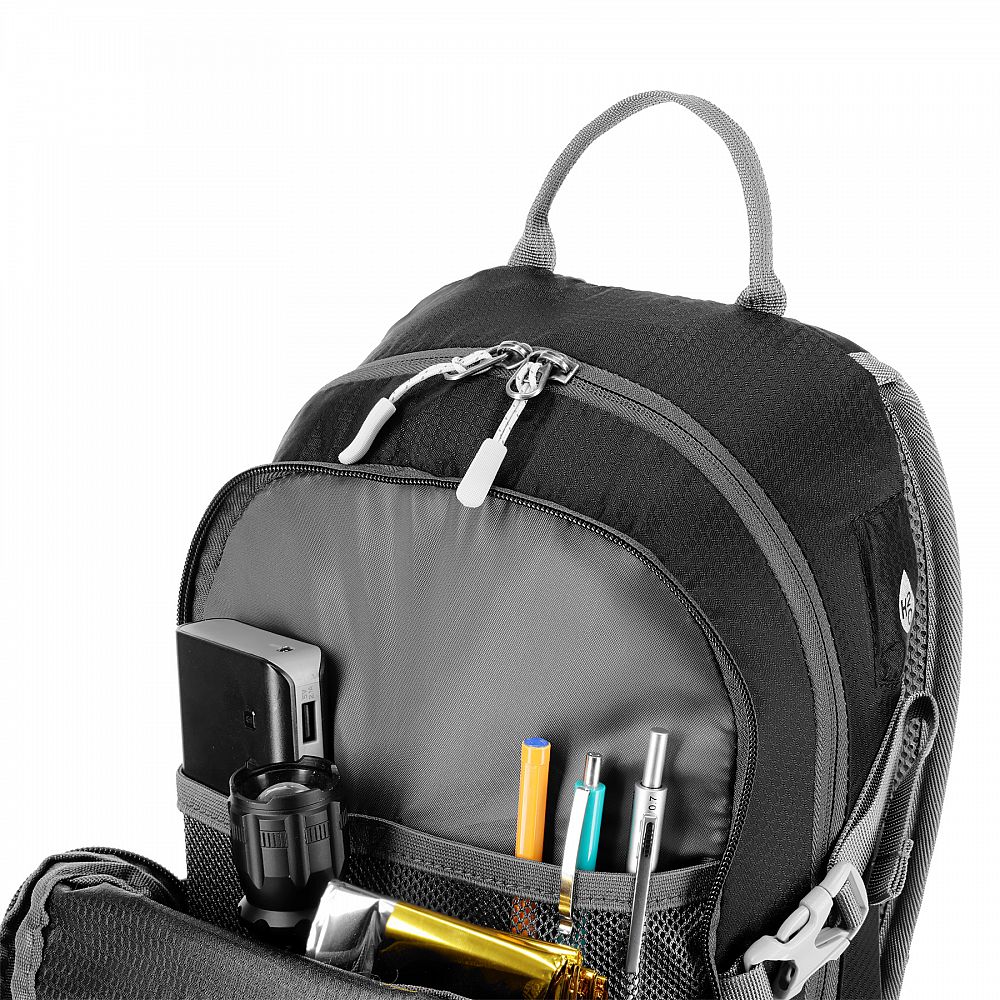 Na pracke hrudného popruhu je umiestnená integrovaná záchranná píšťalka pre väčšiu bezpečnosť v núdzových situáciách. Batoh ďalej ponúka ďalší panel s úchytmi na rôzne príslušenstvo, dve bočné sieťované vrecká a vrecká na zips v bedrovom páse, ideálny na uloženie telefónu alebo iných drobností.