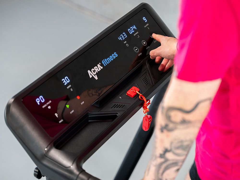 - Bezpečný tréning: Krátky držiak poskytuje stabilitu a bezpečnosť pri cvičení. Bezpečnostný kľúč navyše umožňuje okamžité zastavenie pásu v prípade potreby.