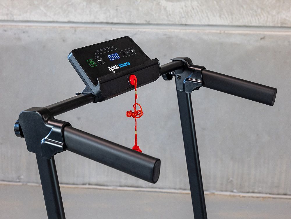 - Bezpečný tréning: Krátky držiak poskytuje stabilitu a bezpečnosť pri cvičení. Bezpečnostný kľúč navyše umožňuje okamžité zastavenie pásu v prípade potreby.