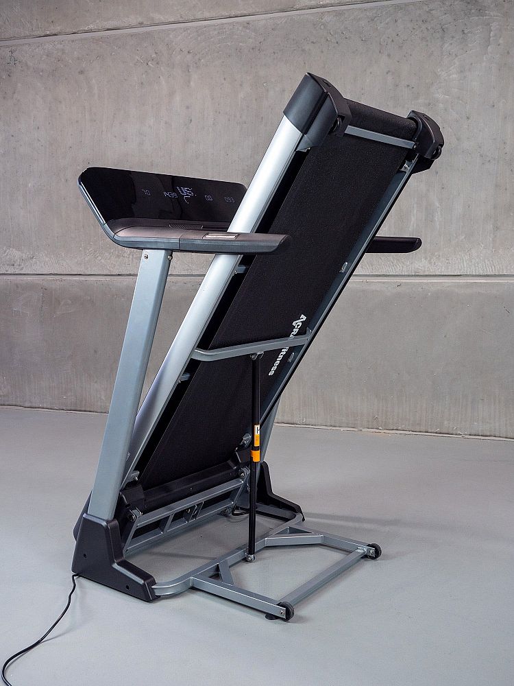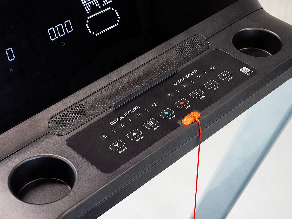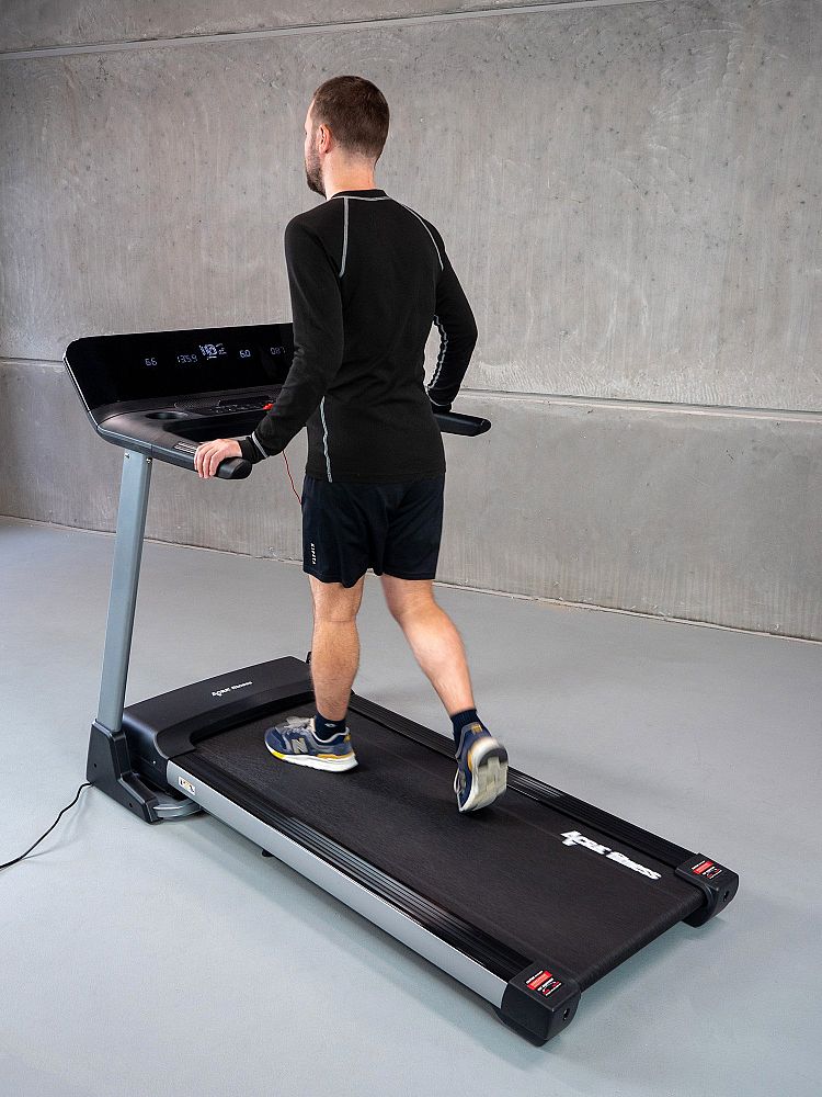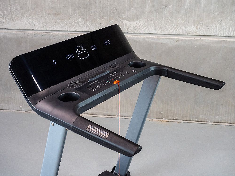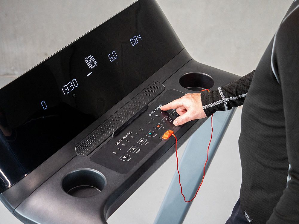 Pás tiež disponuje bezpečnostnou rýchlobrzdou, ktorá umožňuje okamžité zastavenie v prípade potreby. Sklon pásu je možné elektricky nastaviť v rozmedzí 0-15 % priamo z obrazovky, čo umožňuje plynulú zmenu počas behu.