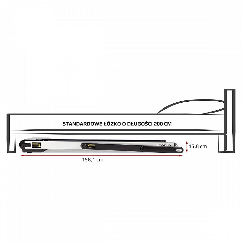 Maximálna rýchlosť trenažéra je 12 km/h, motor má špičkový výkon 2,5 HP. Bežecká plocha s rozmermi 125 x 45 cm je na 6 miestach odpružená pomocou silikagelových silentblokov, ktoré znižujú zaťažovanie kĺbov pri behu. Konzola sa dá ľahko sklopiť k zadnej hrane trenažéra a po sklopení získame rozmer 158 x 77 x 14 cm a trenažér sa tak zmestí za skriňu, alebo pod posteľ. Presúvanie modelu LOOP12 navyše uľahčujú 2 páry koliesok. Prvý pár sa nachádza na spodnej hrane a po zdvihnutí zadnej časti pásu umožňujú pohyb vpred a vzad. Druhý pár koliesok sa nachádza na čele trenažéra a po jeho zdvihnutí do zvislej polohy umožňujú pohyb do strán.