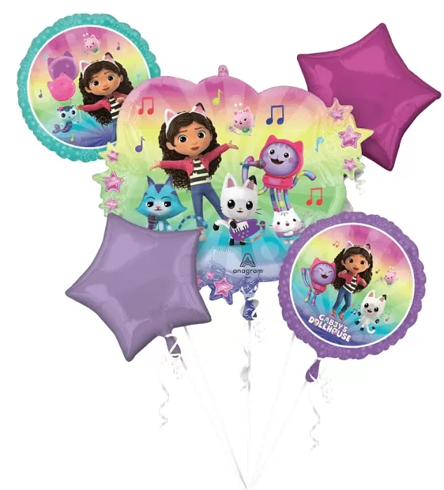 Balónkový buket inspirovaný Gábininým kouzelným domkem potěší každého malého fanouška této oblíbené pohádky. Hlavní balonek ve tvaru obláčku zobrazuje veselý potisk Gábi a jejich kamarádů. V sadě se dále nachází dva kulaté balónky s podobným motivem a dvě barevné hvězdy bez potisku. Hodí se jako dárek k narozeninám nebo jako originální dekorace na dětskou oslavu! Buket můžete doplnit o další produkty z kolekce Gabinin kouzelný domek. Balení: 5 ks Sada obsahuje1 ks fóliový balonek 71 cm x 50 cm, 2 ks fóliový balonek kruh 43 cm, 2 ks fóliový balonek hvězda 45 cm Vhodné k nafouknutí vzduchem i héliem.