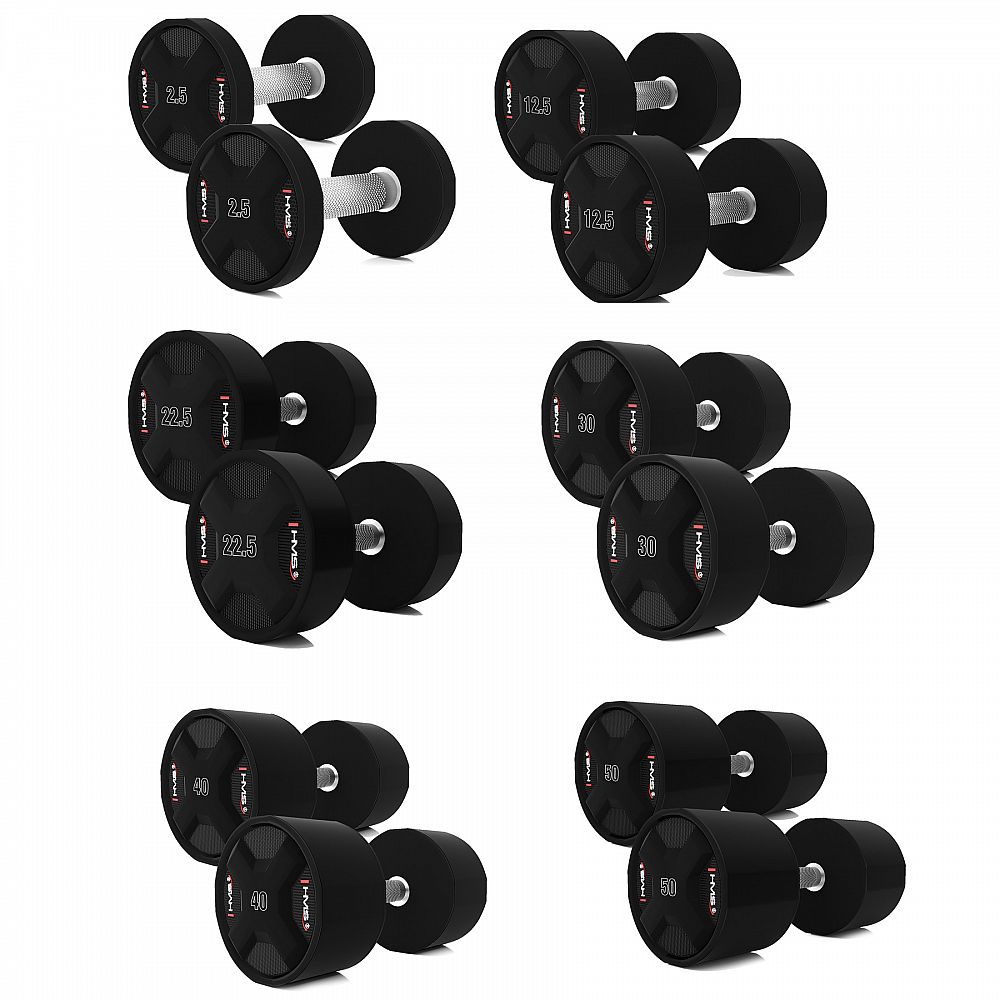 Popis: Súprava jednoručných polyuretánových činiek HMS HPC set 2 x 2,5 - 50 KG CPU - 1050 KG