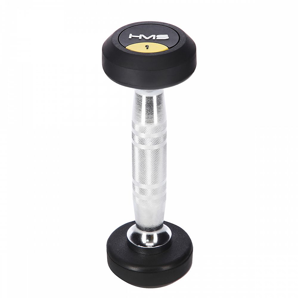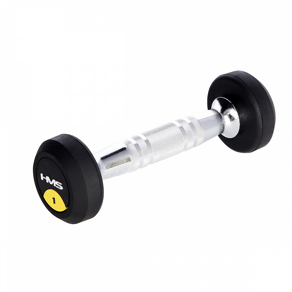 1 kilogramová jednoručná činka HMS HG Pro je určená pre profesionálne použitie ako doma tak v posilňovni. Závažie tvorí liatinový odliatok pokrytý hrubou vrstvou gumy, ktorá ochráni ako činku, tak podklad pred poškodením. Na čelnej strane je značka HMS a údaj o hmotnosti v kilogramoch. Rukoväť je vyrobená z chrómovanej ocele, pre pohodlný úchop má súdkovitý tvar s vrúbkovaním. povrchom.