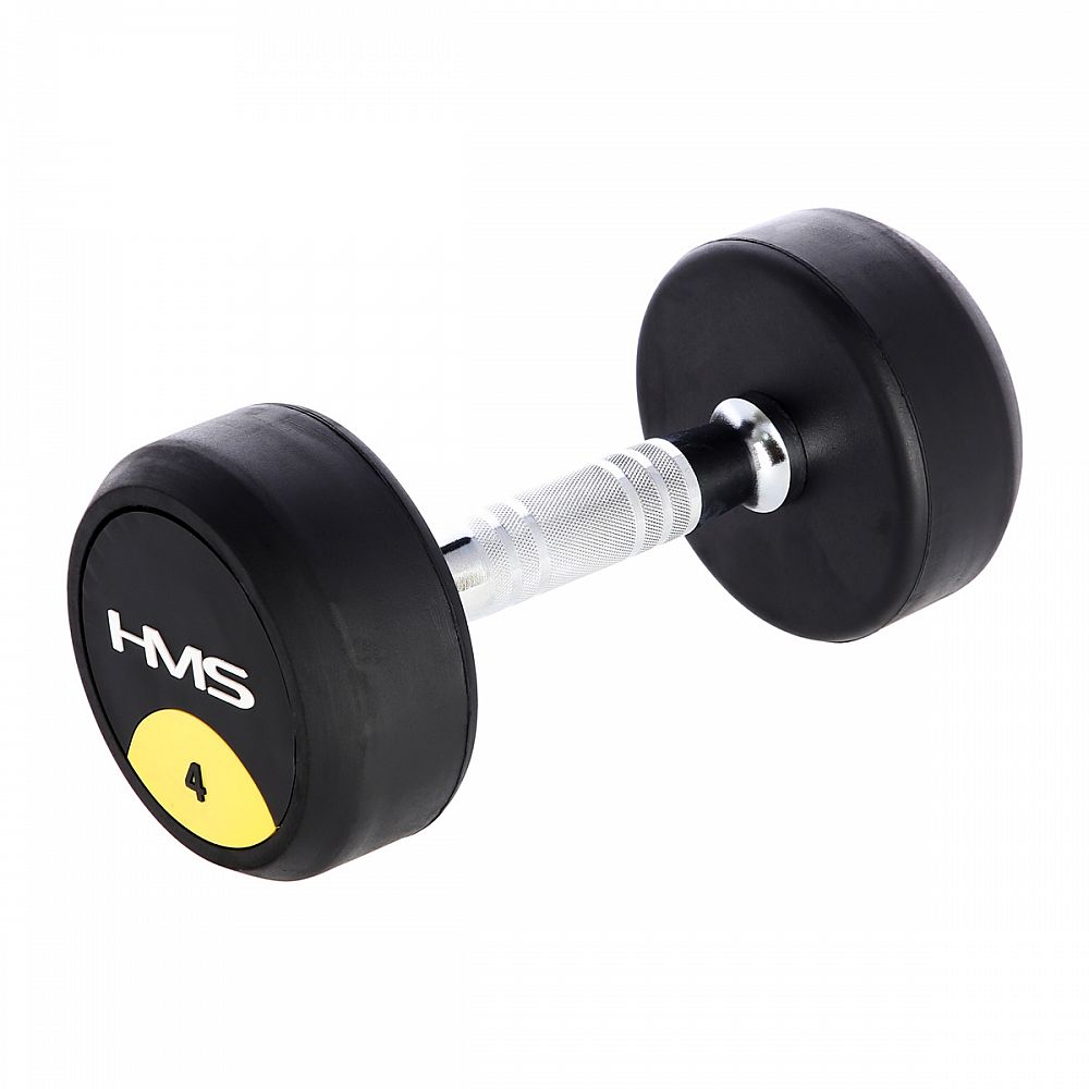 4 kilogramová jednoručná činka HMS HG Pro je určená pre profesionálne použitie ako doma tak v posilňovni. Závažie tvorí liatinový odliatok pokrytý hrubou vrstvou gumy, ktorá ochráni ako činku, tak podklad pred poškodením. Na čelnej strane je značka HMS a údaj o hmotnosti v kilogramoch. Rukoväť je vyrobená z chrómovanej ocele, pre pohodlný úchop má súdkovitý tvar s vrúbkovaným povrchom.