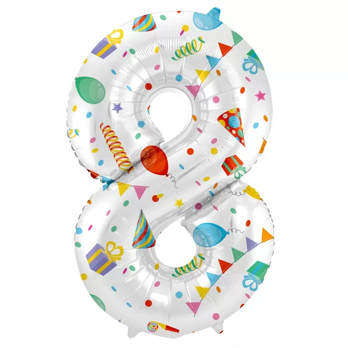 Fóliový balónik v tvare číslice 8 s farebnou párty potlačou. Vhodný na párty a narodeninové oslavy, kde môže vyobraziť vek oslávenca.