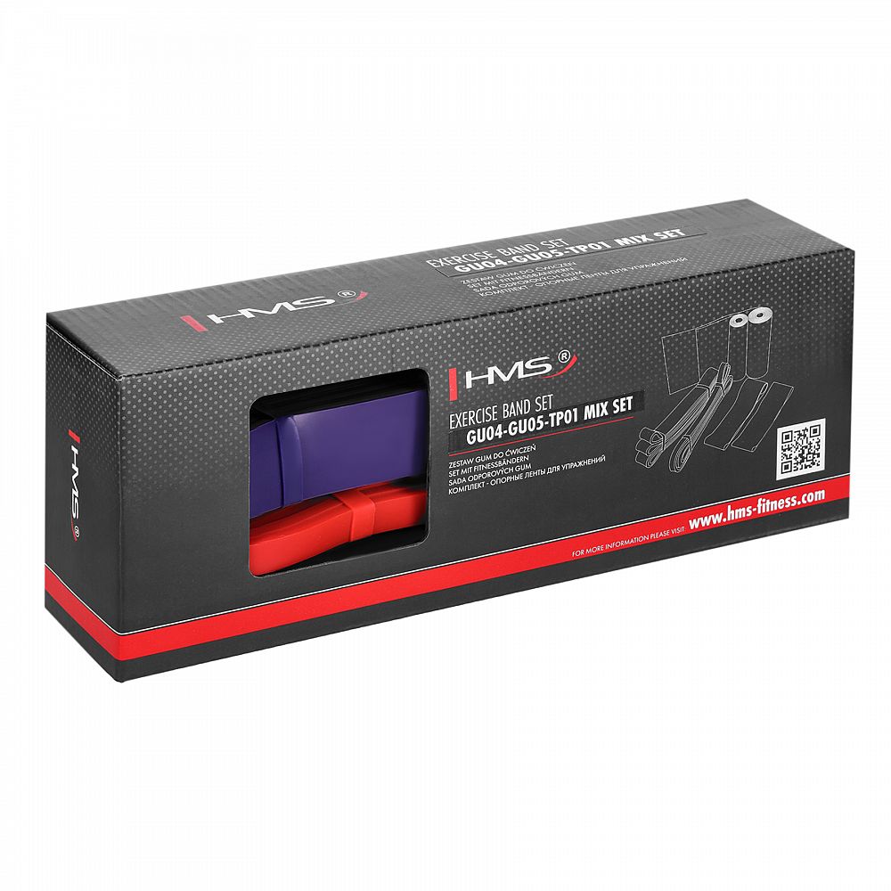 Set 4 posilňovacích gúm HMS ktoré sú využívané v silovom tréningu, kondičnom tréningu, ale aj v rehabilitačnom cvičení. V silovom tréningu slúži ako dopomoc alebo ako dynamická záťaž. Pri rehabilitácii sú využité pretože nejde o priamu záťaž, ale guma postupným ťahom vytvára odpor a to predovšetkým pri úrazoch svalov, šliach a kĺbov.