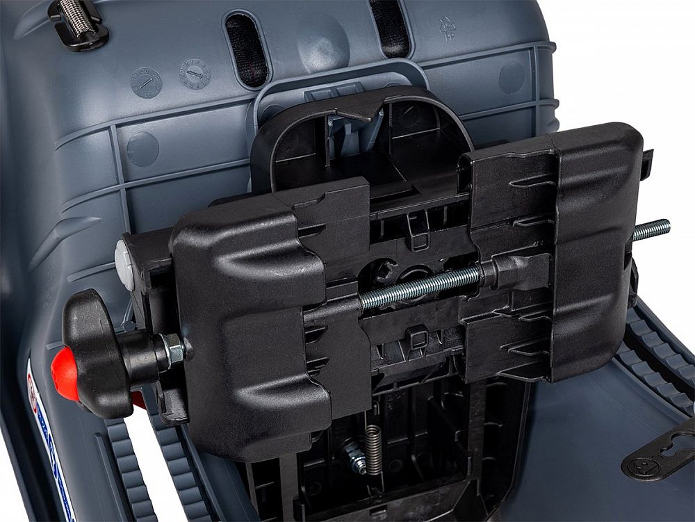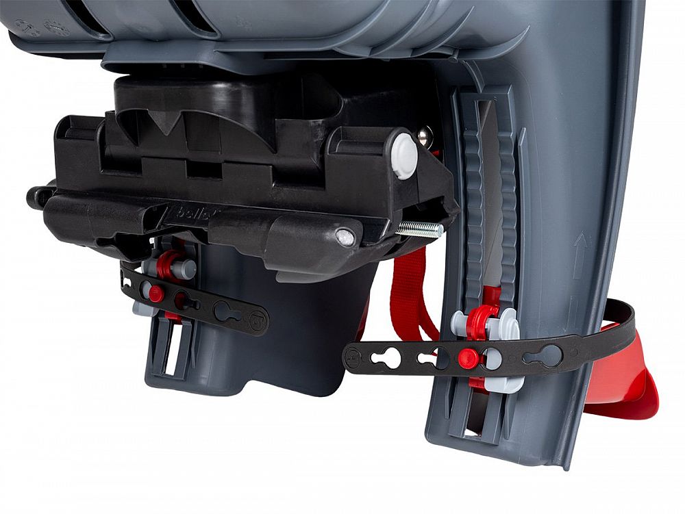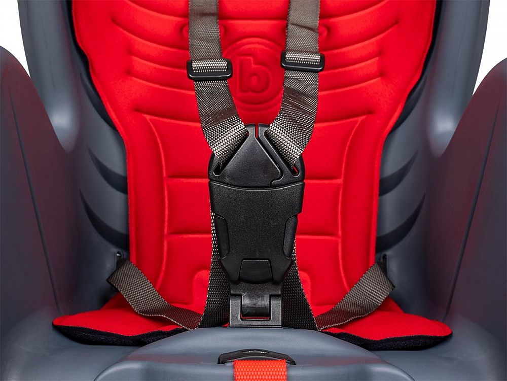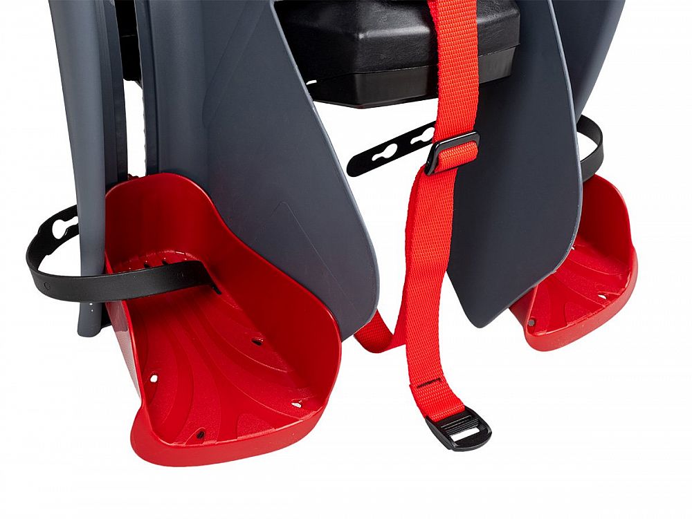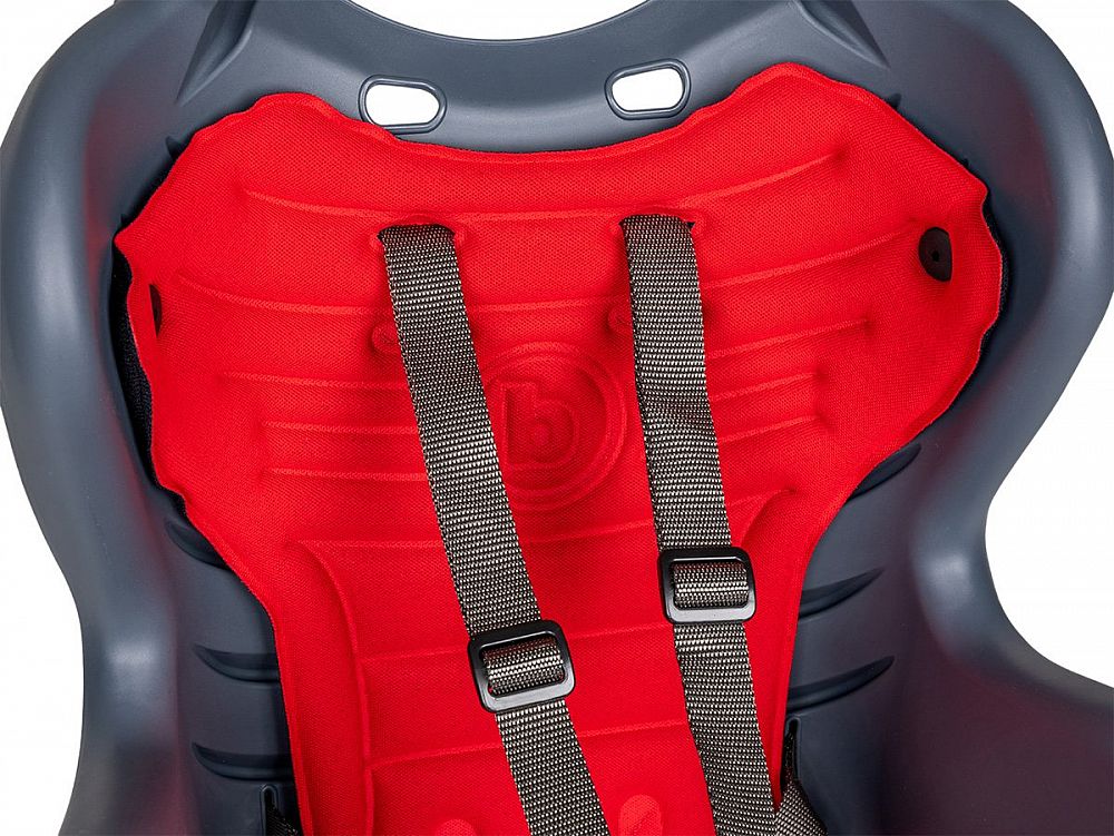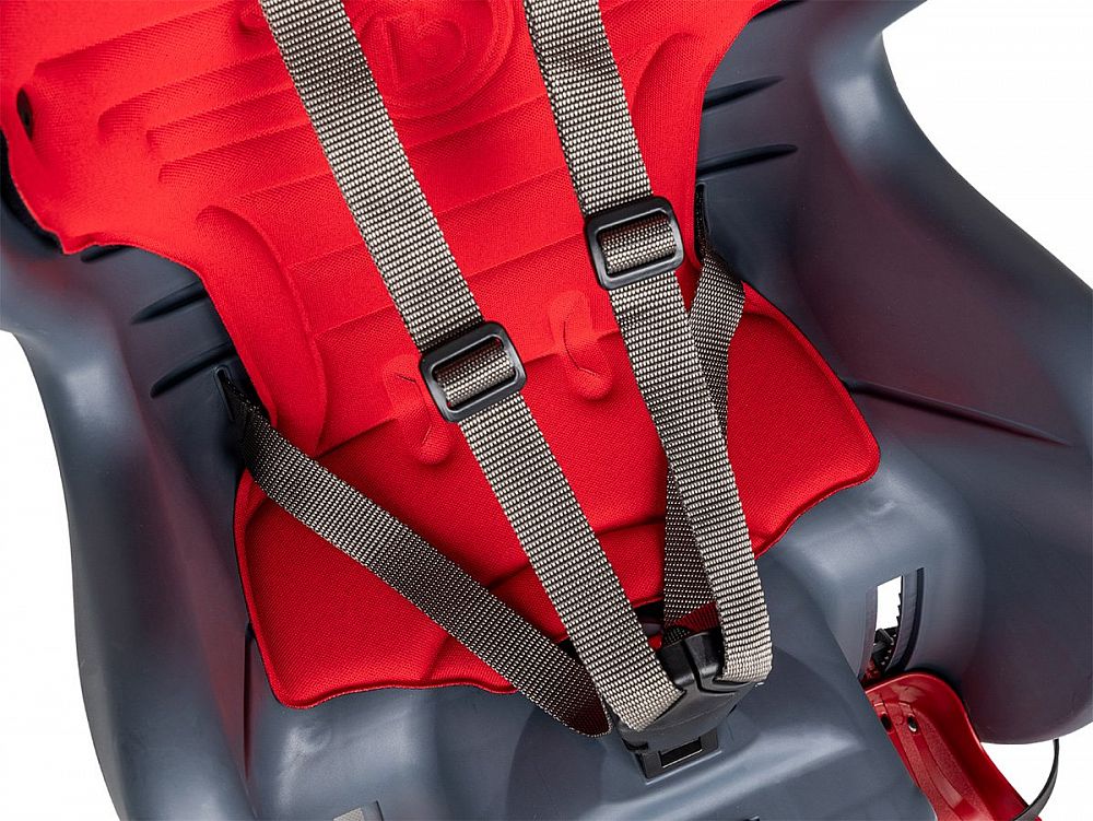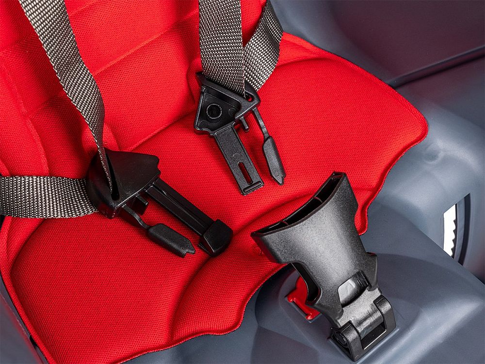 - Bezpečnostný 5bodový pás a ďalší popruh proti skĺznutiu z nosiča (upevnenie k sedlovej trubke)
