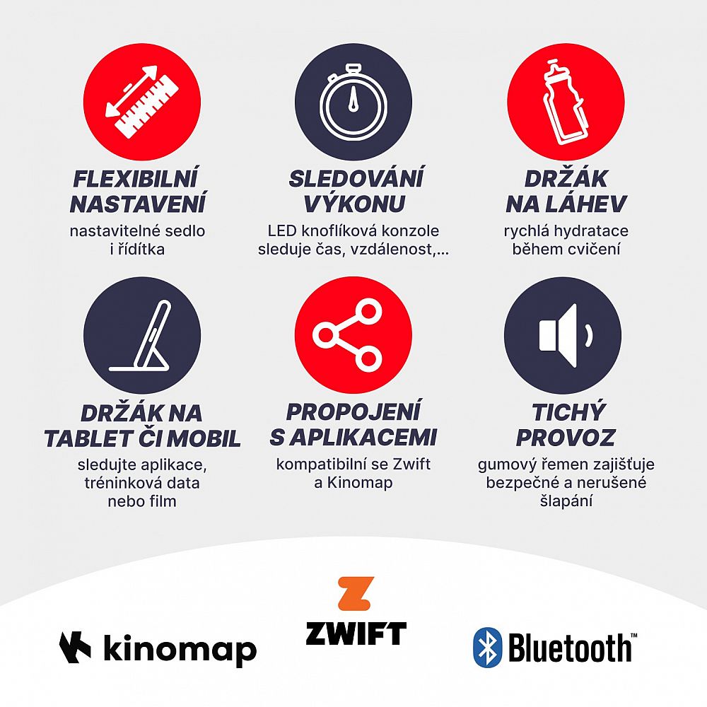 - Kompatibilné s aplikáciami: Možnosť pripojenia cez Bluetooth na obľúbené aplikácie, ako je Zwift a Kinomap pre zábavnejší a interaktívnejší tréning.