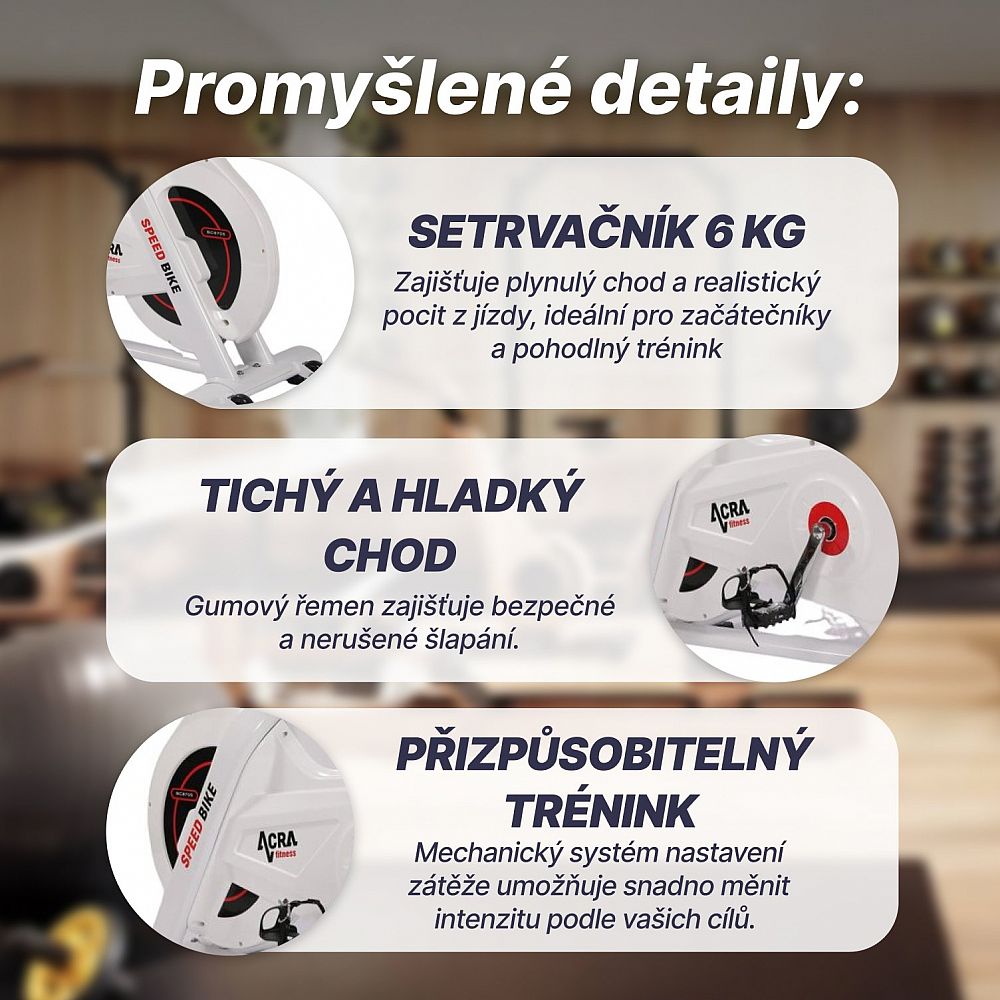 - Zotrvačník 6kg: Ľahší zotrvačník sa ľahšie roztočí a spomalí, čím zaisťuje plynulý chod a realistický pocit z jazdy, akoby ste išli vonku na bicykli. To je ideálne pre začiatočníkov a jazdcov, ktorí preferujú komfortný a tichý tréning.