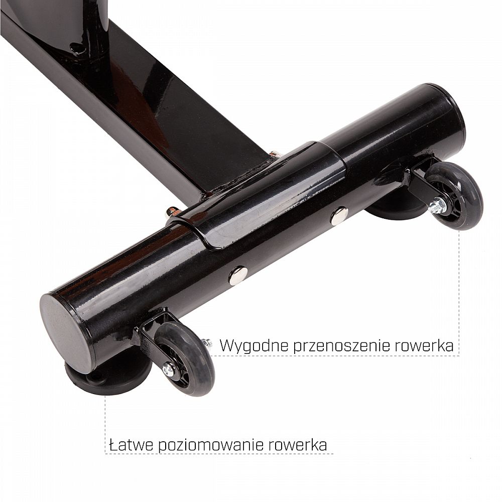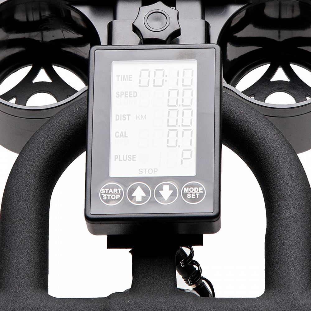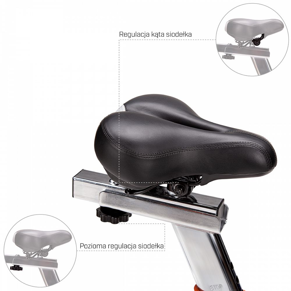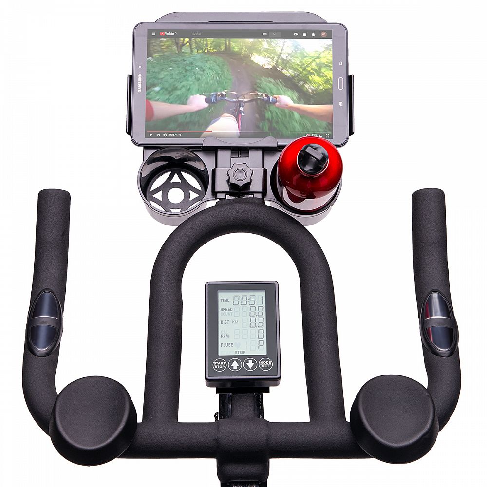 Záťažové koleso má hmotnosť 20 kilogramov. Odpor je generovaný prítlačnou brzdou, ktorá je plynule nastaviteľná pomocou mechanického regulátora pod riadidlami. Pre maximálny komfort počas tréningu sú riadidlá opatrené lakťovými opierkami a sedlo je ergonomicky tvarované s ventilačným otvorom. Riadidlá aj sedlo sú polohovateľné vo vertikálnom aj horizontálnom smere. Oceľové pedále sú osadené klasickými košíkmi s nastaviteľným remienkom, ktoré zaisťujú pevnú polohu chodidla. Veľký a prehľadný displej počítača zobrazuje všetky údaje prehľadne pod sebou, takže už nie je potrebné sa preklikávať cez jednotlivé hodnoty. PC navyše disponuje rozhraním Bluetooth pre spojenie s mobilnou aplikáciou, v ktorej môžete sledovať svoje tréningy a postupy. Konzola na riadidlách umožňuje odloženie mobilného telefónu, alebo tabletu a až dvoch fliaš.