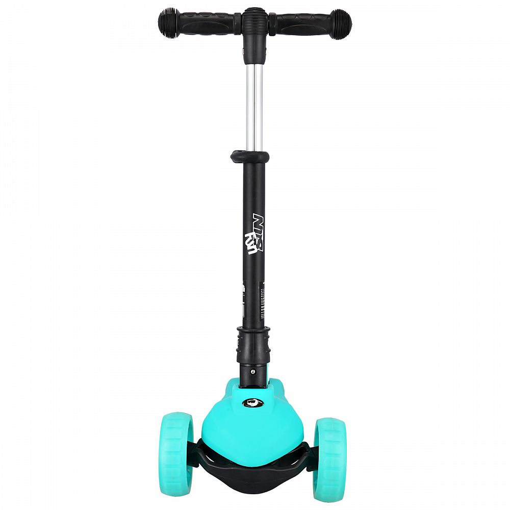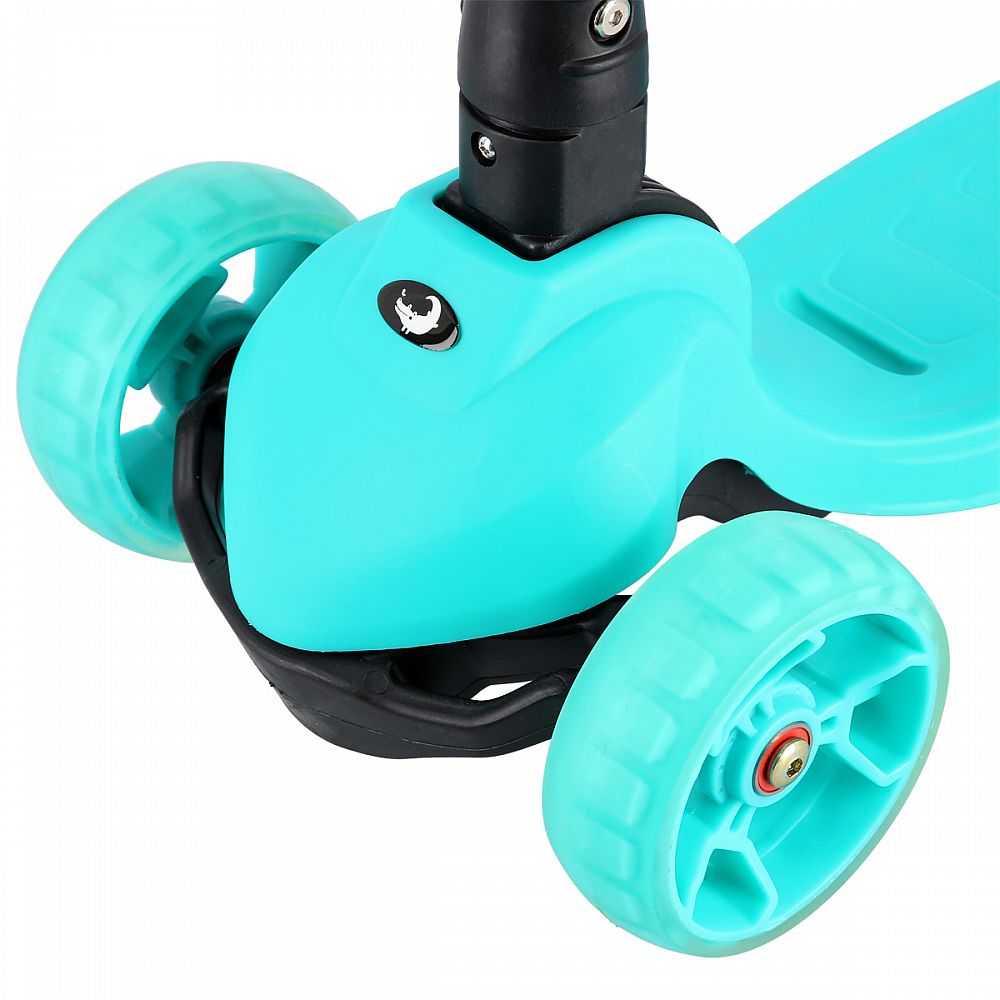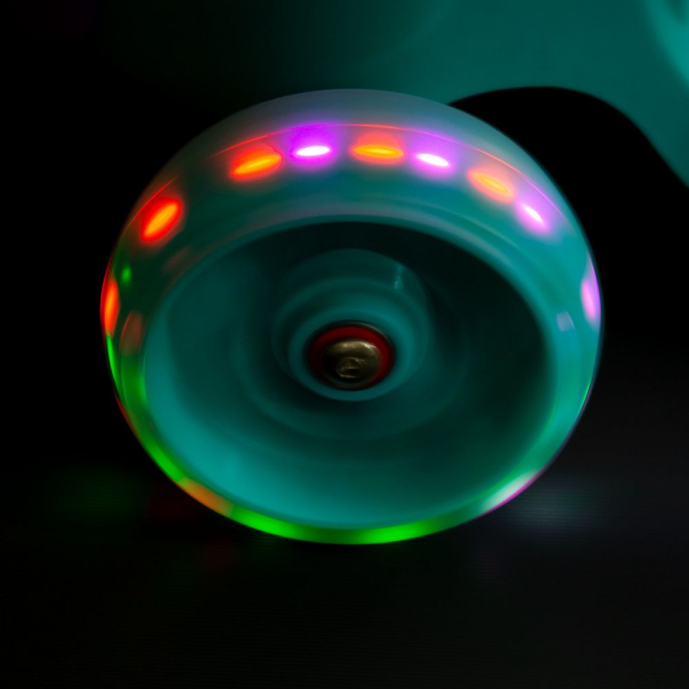 Všetky kolieska v sebe majú ukryté LED diódy, ktoré sa pri pohybe rozsvieti, široké zdaní koliesko zvyšuje stabilitu kolobežky. Riadidlá je možné výškovo nastaviť v rozmedzí 63 - 80 centimetrov.