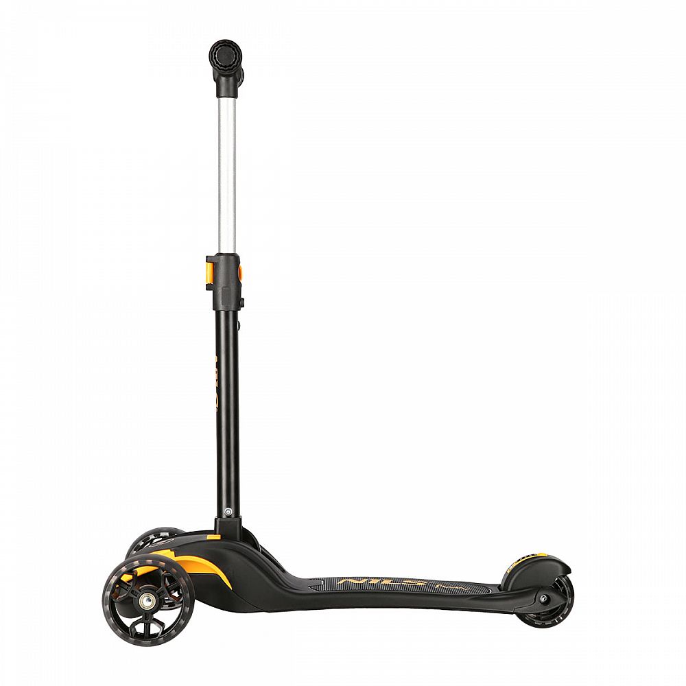 Teleskopické riadidlá sú výškovo nastaviteľné do 4 polôh (63 - 68 - 73 - 78 cm od zeme a 57 - 62 - 67 - 72 cm od stúpadla). Zmena nastavenia výšky sa vykonáva uvoľnením páčky na robustnej objímke, stlačením poistného čapu a vysunutím, alebo zasunutím vnútornej tyče riadidiel. Pre úsporu miesta je možné riadidlá sklopiť - k tomu je potrebné stlačiť tlačidlo vedľa riadidiel a samotné riadidlá potom povysunúť hore. Tento systém sklápania je maximálne bezpečný a nemôže dôjsť k nechcenému sklopeniu počas jazdy. Gripy na riadidlách sú vyrobené z plastu s drážkovaním pre pevný úchop. Konce gripov sú opatrené "klobúčikom", ktorý zamedzuje zošmyknutiu dlane z gripu a zároveň dlaň chráni, keď dieťa náhodou zavadí riadidlom o prekážku - napríklad o fasádu domu, alebo o stĺpik dopravnej značky. Šírka riadidiel je 26 centimetrov a ich úžitková šírka (priestor pre ruky) je 23 centimetrov.