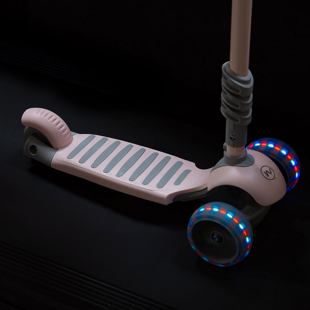 Všetky kolieska v sebe majú ukryté LED diódy, ktoré sa pri pohybe rozsvietia. Svietiace kolieska zvyšujú viditeľnosť kolobežky za šera. Všetky kolieska sú pre plynulý pohyb osadené ložiskami ABEC 7. Široké zadné koliesko zvyšuje stabilitu kolobežky.