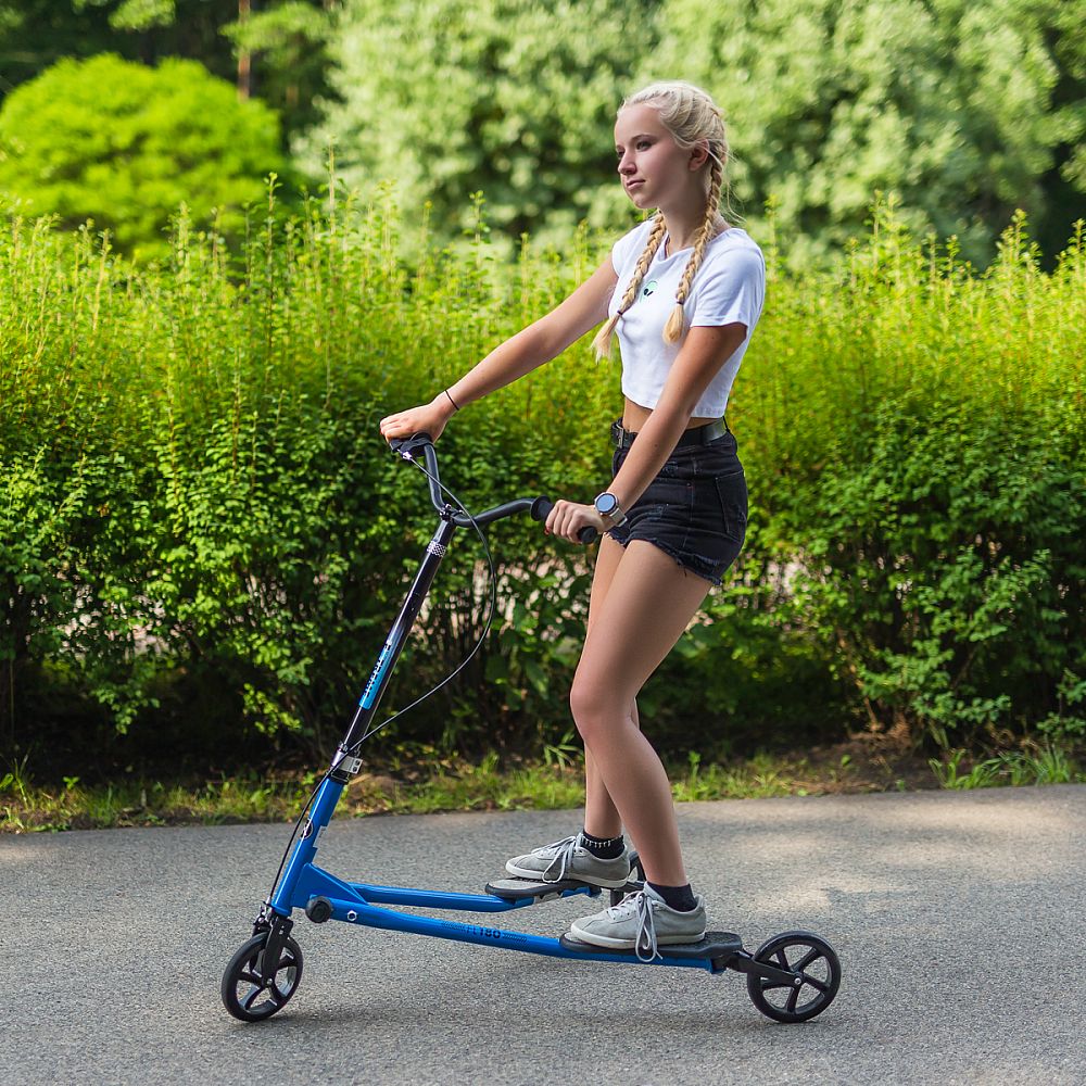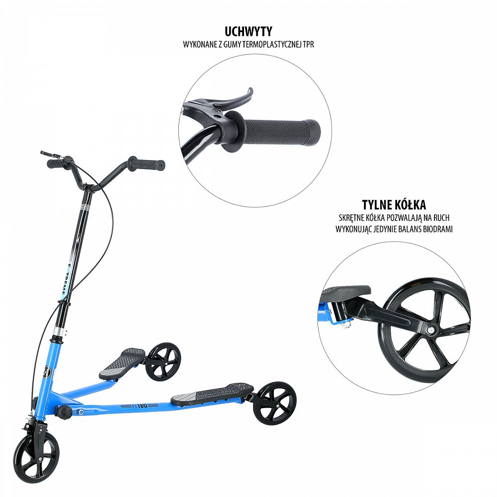 Fliker NILS Extreme FL180 je určen jak pro děti, tak i pro dospělé. Fliker je senzační koloběžka, kterou ženete dopředu rotačním pohybem boků. Jízda na tomto typu koloběžky je zábavná a dostane každého! Ovládání je navíc snadné a dokonale plynulé! Zkušení jezdci dokáží na Flikeru neskutečné triky a dosahují rychlosti až 20 km/h. Navíc, což je možná to nejdůležitější, při jízdě zapojujete všechny svaly těla a tudíž napomáhá zesílení a redukci tuku. Ergonomické rukojeti trojkoloběžky absorbují vibrace a dokonale padnou do ruky! Brzdový systém Grip Brake vám vždy umožní bezpečně zastavit. Bezpečností dorazy zabraňují převrácení koloběžky!