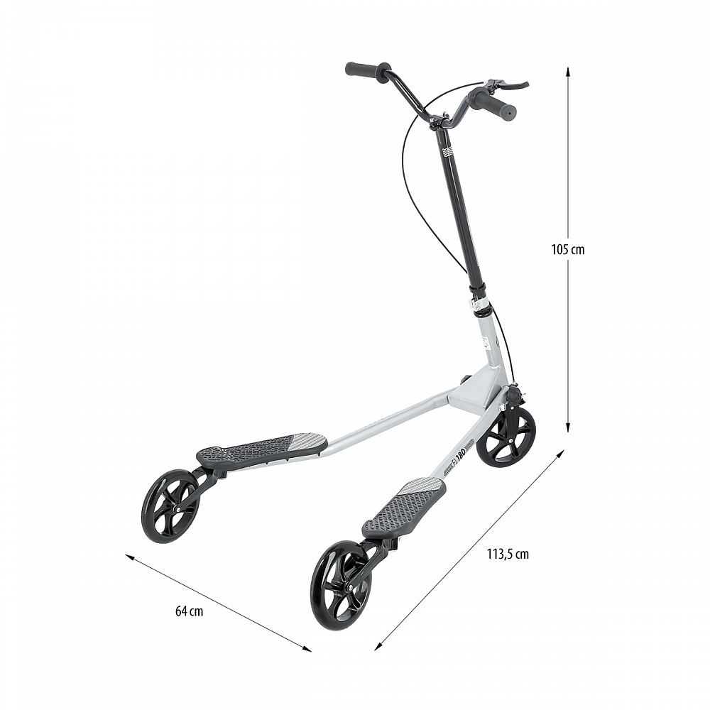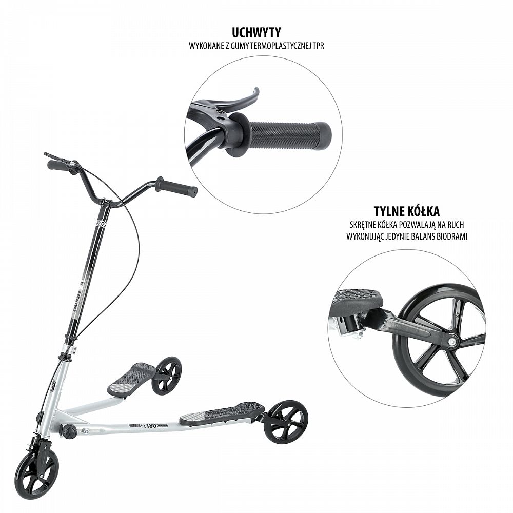 Fliker NILS Extreme FL180 je určený ako pre deti, tak aj pre dospelých. Fliker je senzačná kolobežka, ktorú ženiete dopredu rotačným pohybom bokov. Jazda na tomto type kolobežky je zábavná a dostane každého! Ovládanie je navyše ľahké a dokonale plynulé! Skúsení jazdci dokážu na Flikeri neskutočné triky a dosahujú rýchlosť až 20 km/h. Navyše, čo je možno to najdôležitejšie, pri jazde zapájate všetky svaly tela a teda napomáha zosilneniu a redukcii tuku. Ergonomické rukoväte trojkolobežky absorbujú vibrácie a dokonale padnú do ruky! Brzdový systém Grip Brake vám vždy umožní bezpečne zastaviť. Bezpečnostné dorazy zabraňujú prevráteniu kolobežky!