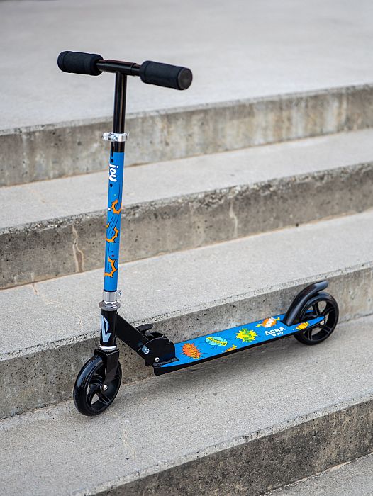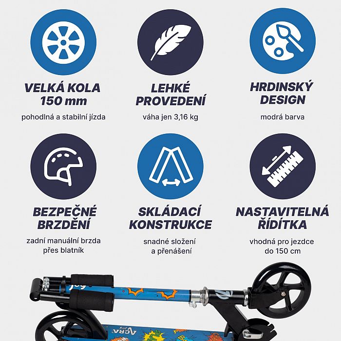 - Kolobežka má modrý hrdinský design.