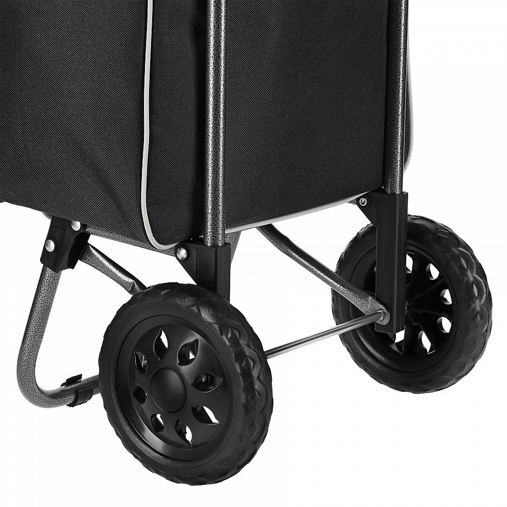 Vozík je vybavený pevným oceľovým rámom, ktorý zaisťuje odolnosť a stabilitu aj pri plnom zaťažení. Hlavná komora je vyrobená z odolného polyesteru 600D Oxford s vysokou odolnosťou proti vlhkosti a nečistotám. Jej objem je približne 40 litrov, čo umožňuje uložiť veľký nákup.