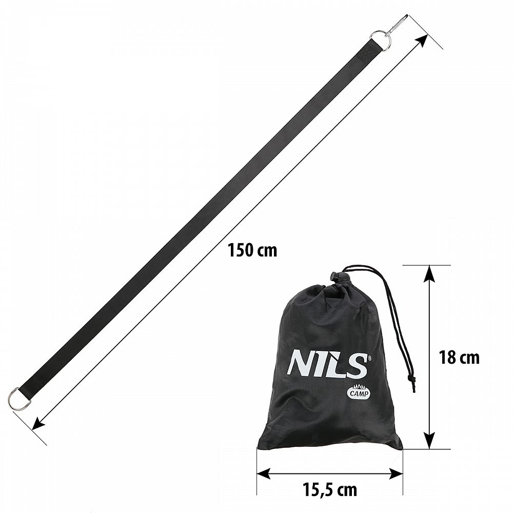 Súprava 2 polyesterových popruhov s oceľovými okami NILS Camp NC1722 je určený na zavesenie hojdačiek, hojdacích sietí, posilňovacích systémov a brazílskych kresiel všade tam, kde nestačí dĺžka originálnych lán. Pokiaľ máte napríklad trámy na terase príliš vysoko na zavesenie hojdačky, alebo stromy na záhrade sú príloš ďaleko na napnutie hamaky, potom je NC1722 ideálne riešenie. V prípade potreby je možné viac popruhov spojiť pomocou karabín.