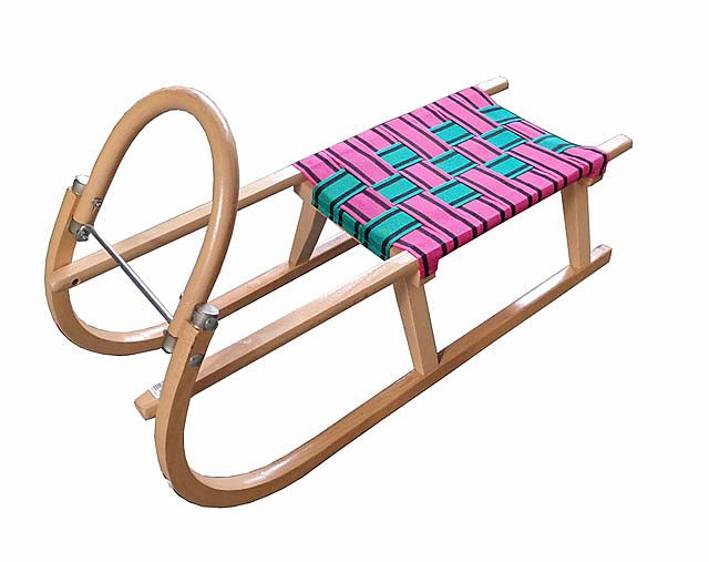 Sane celodrevené, s textilným popruhom na sedáku a kovovými lyžinami.