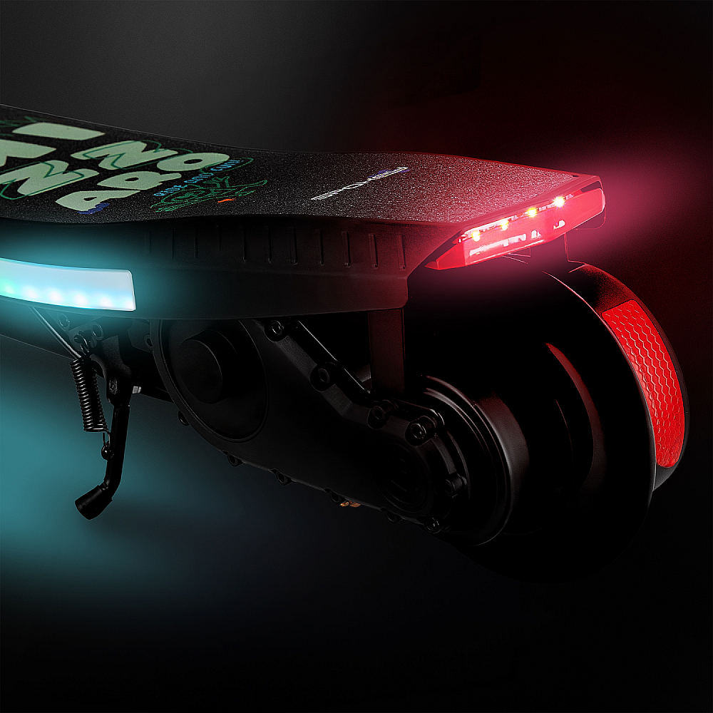 - Maximálna viditeľnosť: Predné biele a zadné červené LED svetlá, spolu s farebným LED pásikom na doske, zaistí skvelú viditeľnosť aj po zotmení.