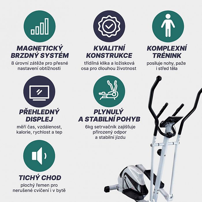 Magnetický crossový trenažér BE42 Brother je kvalitný posilňovací stroj s nasledujúcimi parametrami: magnetická brzda s ôsmimi stupňami záťaže, váha zotrvačníkového kolesa 5 kg s účinným magnetickým systémom nastavovanie odporu, stredová os na troch špeciálnych guľkových ložiskách, trojdielna kľuka. Prevod plochým remeňom umožňuje umiestnenie v miestnosti, pretože elliptical má veľmi tichý chod. Stroj má moderný tvar aj kvalitné prevedenie.