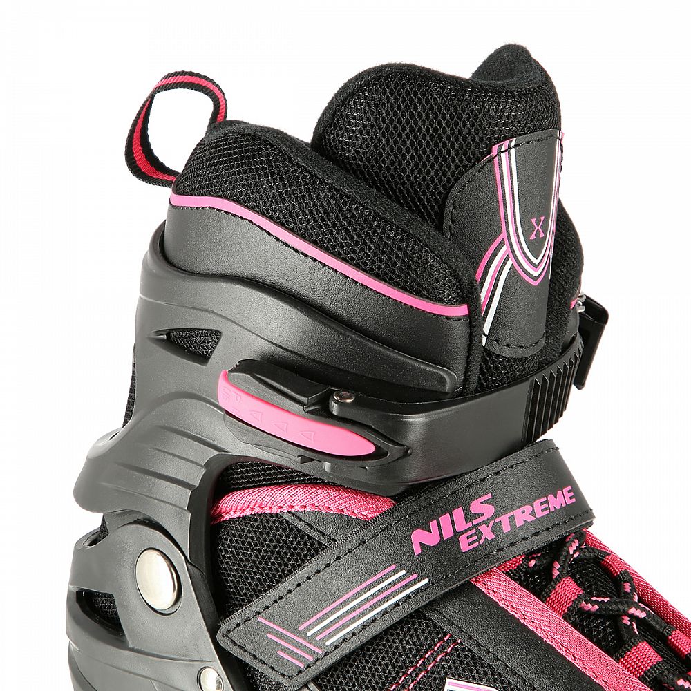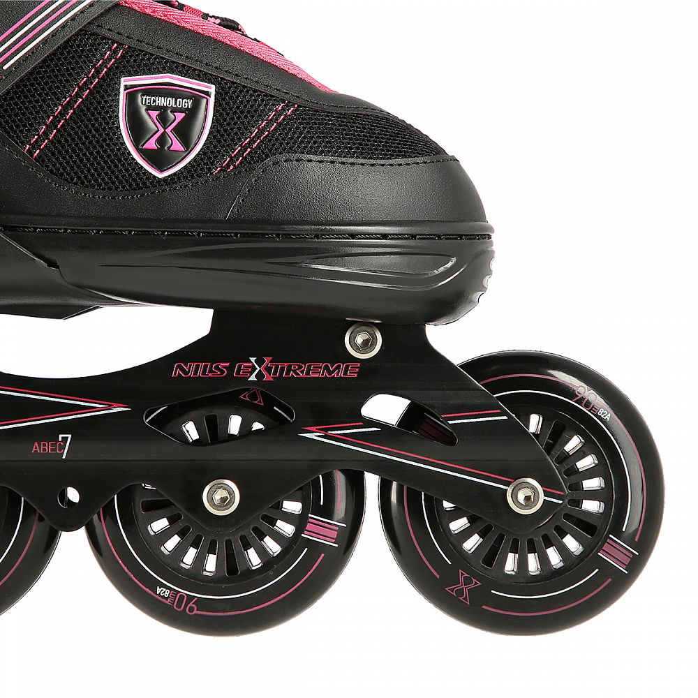 Kolieskové korčule NILS Extreme NA19088 sú určené na rekreačnú jazdu po rovných a hladkých chodníkoch, ako napríklad po asfalte. Polomäkká, ľahká a odolná topánka je vyrobená z kombinácie sieťoviny MESH a peny EVA, špička je vybavená ventilačnými otvormi, tieto vlastnosti zaručujú priedušnosť topánky, znižujú potenie nohy a predchádza tak vlhnutiu vložky. Systém ventilácie a tvarovaná stielka topánky tak priamo ovplyvňujú zvýšenie užívateľského komfortu. Sketel modelu NH19088 je vyrobený z polypropylénu, ktorý je veľmi odolný a vydrží aj tie najtvrdšie pády, zároveň stabilizuje chodidlo v oblasti členka. Vonkajšia topánka je pomocou stlačenia tlačidla nastaviteľná do štyroch veľkostí, toto riešenie umožňuje precízne prispôsobenie veľkosti podľa aktuálnych potrieb alebo sa používa ako „rastúca topánka“, ktorá „rastie“ spolu s nohou dieťaťa. Bezpečnosť korčule zvyšuje zapínanie na dvojsekčnú pracku, remienok so suchým zipsom a šnurovanie. Polyuretánové kolieska s tvrdosťou 82A dobre priliehajú k podkladu a sú uložené v hliníkovej klietke vyrobenej z jedného kusu hliníka, ktorý je vstrekovaný do formy pod vysokým tlakom. Model NA19088 je osadený ložiskami ABEC 7, ktoré sa vyznačujú nízkym odporom, kedy jazda má dobrú zotrvačnosť a na korčuliach tak možno dosiahnuť vysokú rýchlosť, alebo uraziť dlhšiu vzdialenosť bez vynaloženia zbytočnej sily.