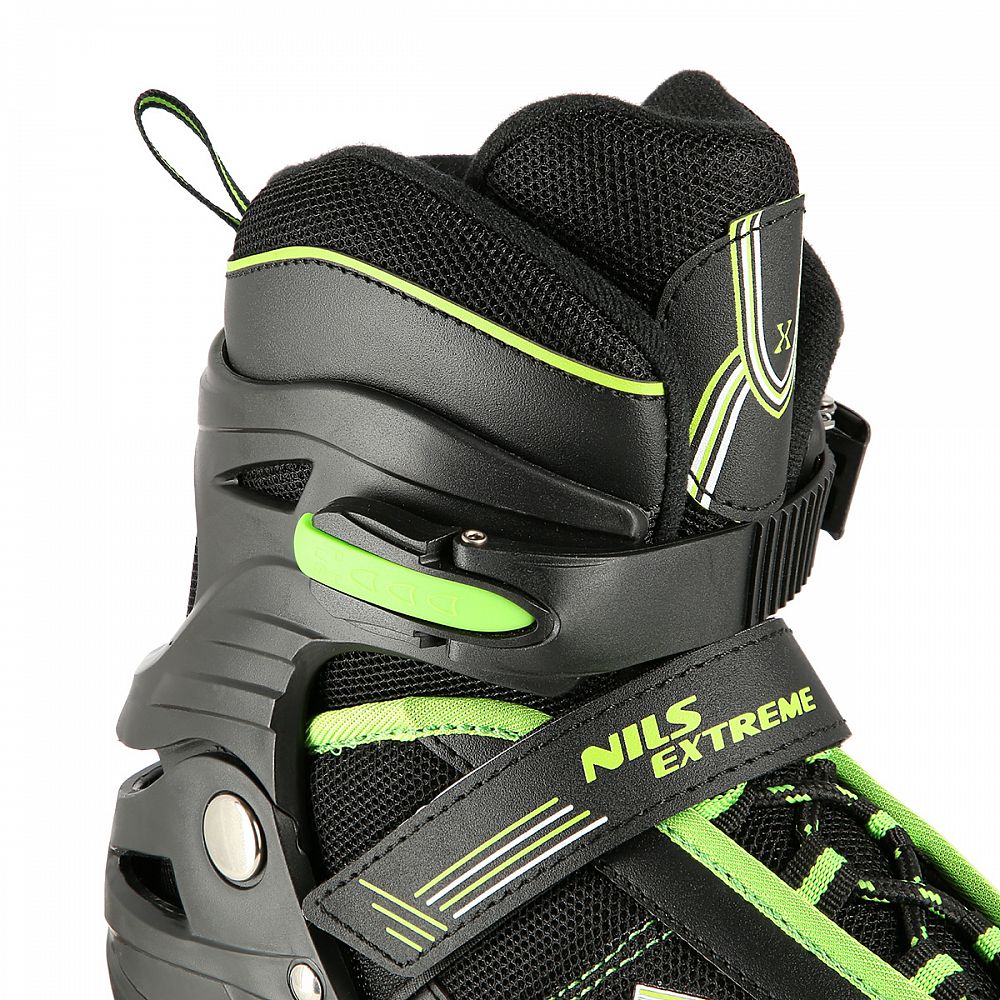 Kolieskové korčule NILS Extreme NA19088 sú určené na rekreačnú jazdu po rovných a hladkých chodníkoch, ako napríklad po asfalte. Polomäkká, ľahká a odolná topánka je vyrobená z kombinácie sieťoviny MESH a peny EVA, špička je vybavená ventilačnými otvormi, tieto vlastnosti zaručujú priedušnosť topánky, znižujú potenie nohy a predchádza tak vlhnutiu vložky. Systém ventilácie a tvarovaná stielka topánky tak priamo ovplyvňujú zvýšenie užívateľského komfortu. Sketel modelu NH19088 je vyrobený z polypropylénu, ktorý je veľmi odolný a vydrží aj tie najtvrdšie pády, zároveň stabilizuje chodidlo v oblasti členka. Vonkajšia topánka je pomocou stlačenia tlačidla nastaviteľná do štyroch veľkostí, toto riešenie umožňuje precízne prispôsobenie veľkosti podľa aktuálnych potrieb alebo sa používa ako „rastúca topánka“, ktorá „rastie“ spolu s nohou dieťaťa. Bezpečnosť korčule zvyšuje zapínanie na dvojsekčnú pracku, remienok so suchým zipsom a šnurovanie. Polyuretánové kolieska s tvrdosťou 82A dobre priliehajú k podkladu a sú uložené v hliníkovej klietke vyrobenej z jedného kusu hliníka, ktorý je vstrekovaný do formy pod vysokým tlakom. Model NA19088 je osadený ložiskami ABEC 7, ktoré sa vyznačujú nízkym odporom, kedy jazda má dobrú zotrvačnosť a na korčuliach tak možno dosiahnuť vysokú rýchlosť, alebo uraziť dlhšiu vzdialenosť bez vynaloženia zbytočnej sily.