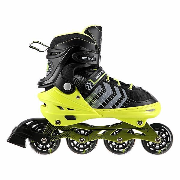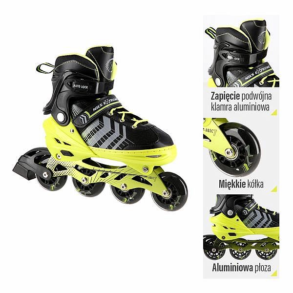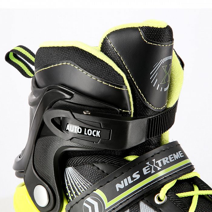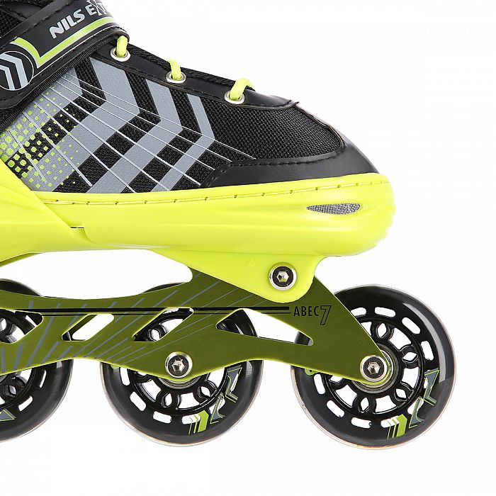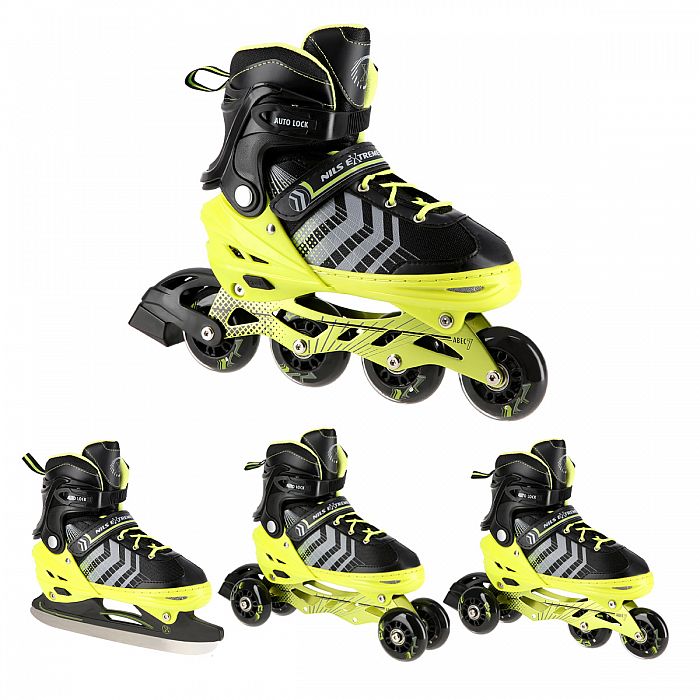 NILS Extreme NH18192 sú kolieskové korčule 4v1 s vymeniteľným nožom na ľad, ktoré sú určené pre začínajúcich a stredne pokročilých užívateľov. Hliníkový podvozok je osadený mäkkými PU kolieskami s ložiskami ABEC7 pre svižnú jazdu. Vonkajšia topánka je pomocou stlačenia tlačidla nastaviteľná do štyroch veľkostí, toto riešenie umožňuje precízne prispôsobenie veľkosti podľa aktuálnych potrieb alebo sa používa ako "rastúca topánka", ktorá "rastie" spolu s nohou dieťaťa. Na špičke sú ventilačné otvory pre maximálnu priedušnosť. Vnútorná topánka je vyrobená z kombinácie semišu, sieťoviny MESH, EVA a peny s vysokou hustotou. Zapínanie je riešenou klasickou trojkombináciou - šnurovanie, remienok so suchým zipsom a dvojsekčná pracka. Súčasťou balenia je sada skrutiek a podložiek na prestavbu podvozku do konfigurácie 2+1 a 2+2 a pár nožov na ľad, ktoré sú vyrobené z nerez ocele s vysokým podielom uhlíka.