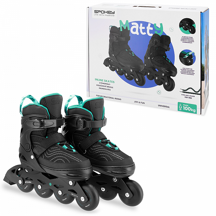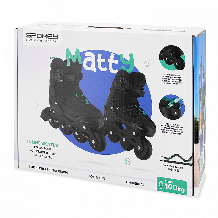 Nastaviteľné kolieskové korčule Spokey MATTY sú najlepšou voľbou ako pre začiatočníkov, tak pre zdokonaľovanie vašich schopností! Sú stvorené na objavovanie vášne na korčuľovanie - ak chcete začať svoje dobrodružstvo, pomôžu vám zvládnuť základy. A pokiaľ už základy ovládate, budú korčule MATTY ideálnou voľbou pre rekreačnú a dynamickú jazdu. To všetko vďaka použitiu najlepších parametrov a moderných technologických riešení!