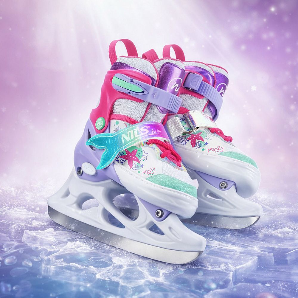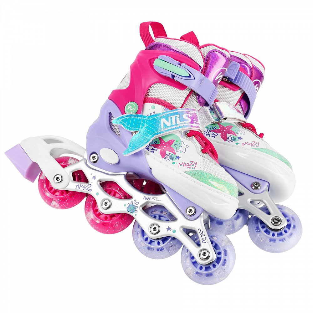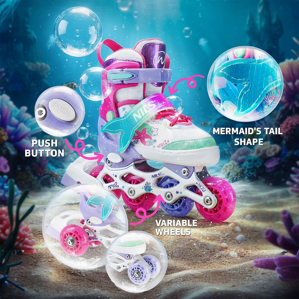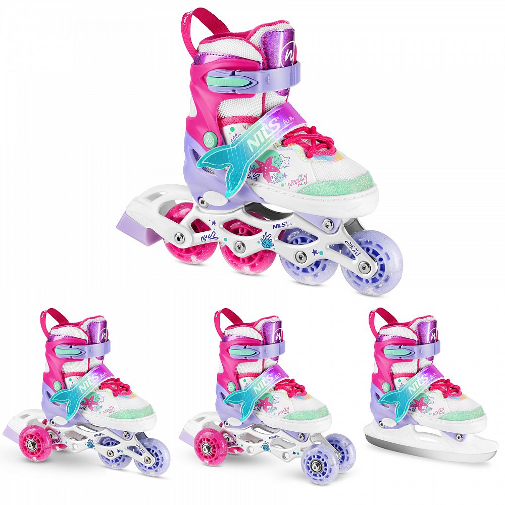 NH18150 MAZZY značky NILS Fun je jedinečný detský set 4v1, ktorý spája funkčnosť, bezpečnosť a atraktívny rozprávkový dizajn inšpirovaný podmorským svetom. Jeden produkt ponúka hneď štyri konfigurácie – kolieskové korčule, ľadové korčule, quad korčule a 2+1+1 pre začiatočníkov – a je tak ideálny na celoročné využitie.