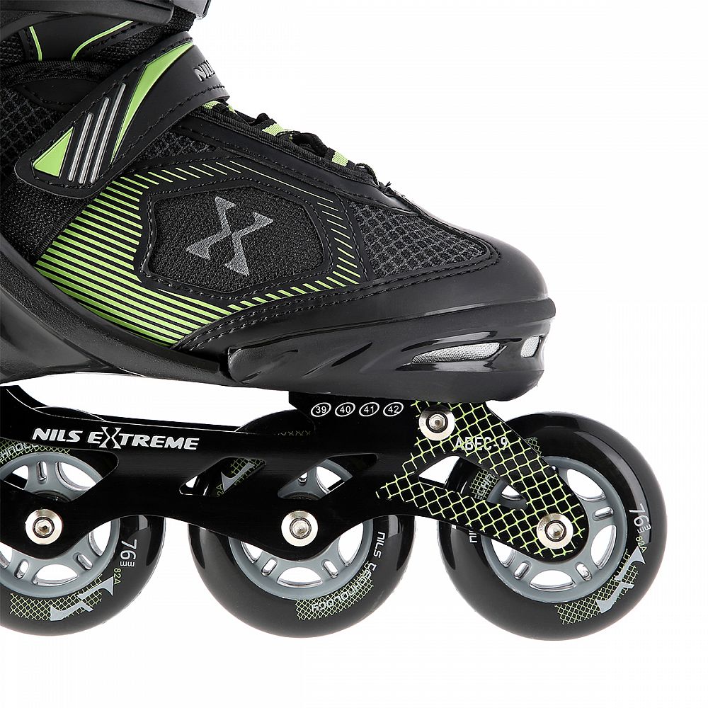 Kolieskové korčule NILS Extreme NA9080 sú určené na rekreačnú jazdu začínajúcich a mierne pokročilých korčuliarov po rovných a hladkých chodníkoch, ako napríklad po asfalte. Ľahká a odolná topánka zaisťuje bezpečnosť pri jazde. Systém ventilácie a tvarovaná stielka topánky priamo ovplyvňujú zvýšenie užívateľského komfortu. Ide o model s nastaviteľnou veľkosťou, kedy každá korčule má na výber zo 4 rozmerov. Pomocou jednoduchého riadiaceho systému je možné ľahko a rýchlo nastaviť veľkosť topánky na nohe používateľa. Kolieska s tvrdosťou 82A sú uložené v hliníkovej lište, dobre priliehajú k podkladu a čiastočne pohlcujú nervnosti. Model NA9080 je osadený ložiskami ABEC 9, ktoré sa vyznačujú precíznym spracovaním a nízkym odporom, kedy jazda má dobrú zotrvačnosť a na korčuliach tak je možné uraziť dlhú vzdialenosť bez vynaloženia zbytočnej sily.