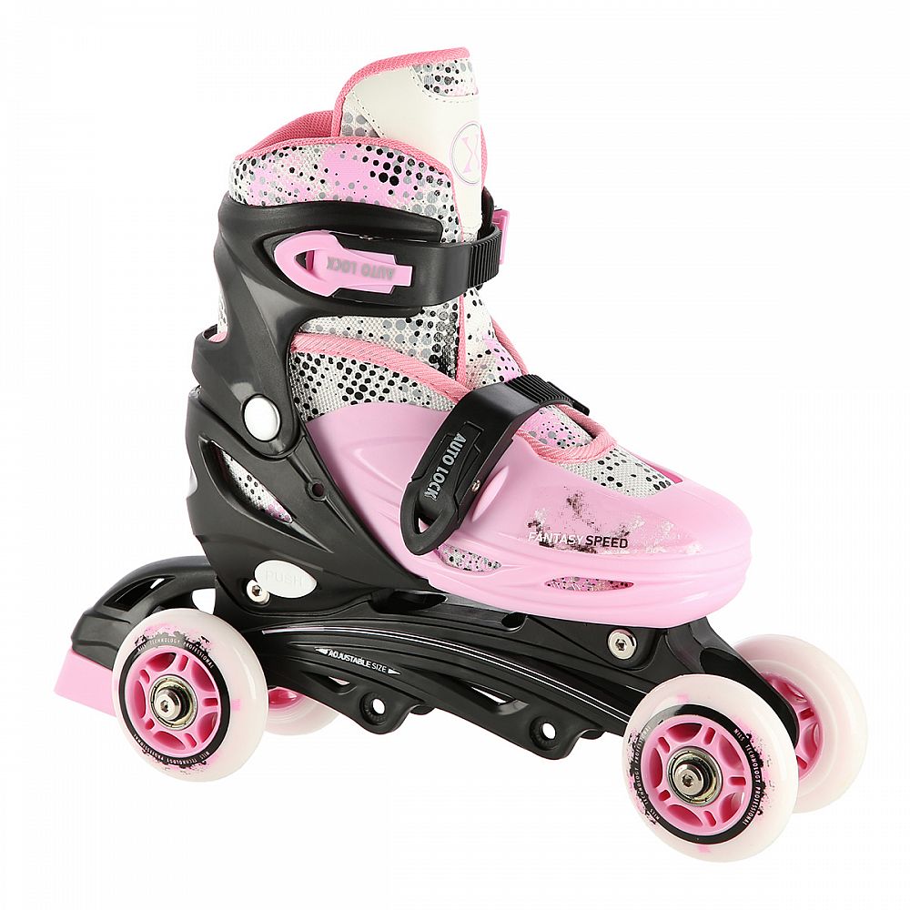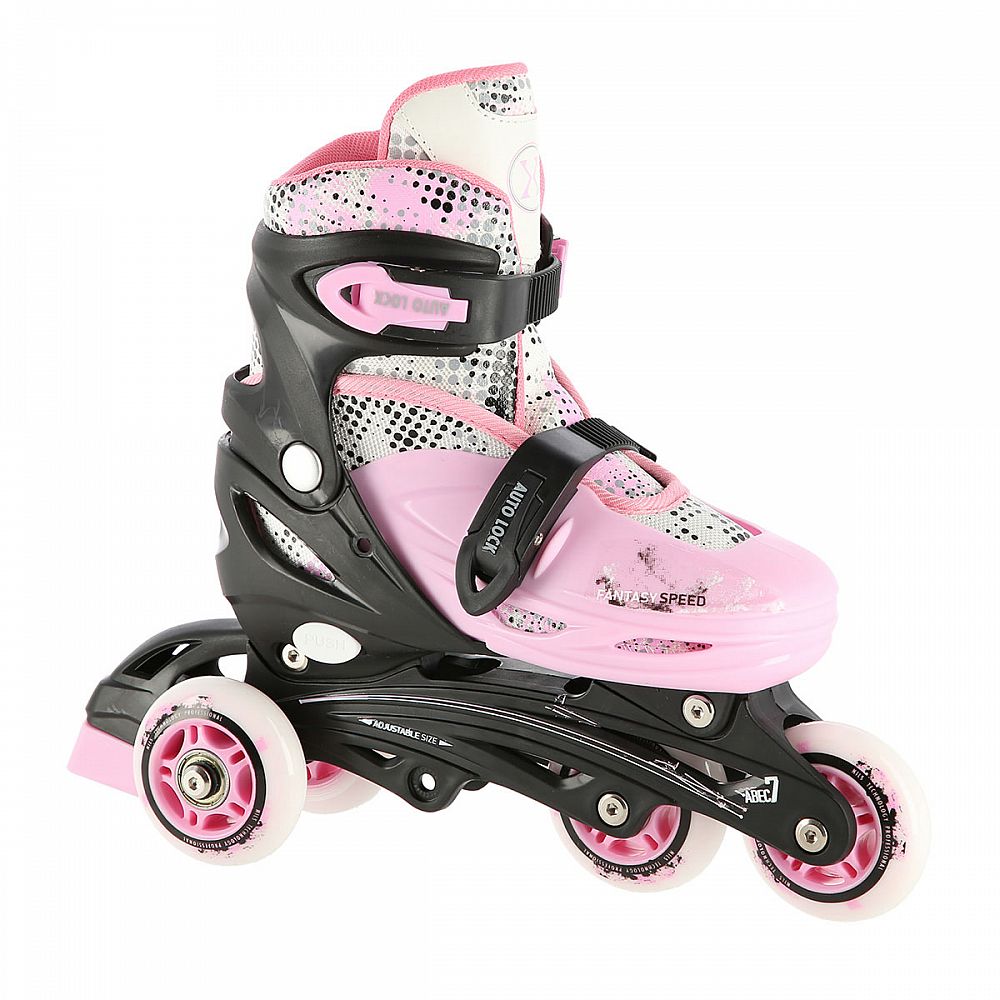 Plastový podvozek je osazen měkkými PU kolečky s ložisky ABEC7 pro svižnou jízdu. Vnější bota je pomocí stisku tlačítka nastavitelná do čtyř velikostí, toto řešení umožňuje precizní přizpůsobení velikosti podle aktuálních potřeb anebo se používá jako "rostoucí bota", která "roste" spolu s nohou dítěte.