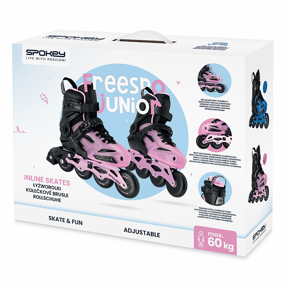 FREESPO JUNIOR sú korčule, ktoré urobia radosť každému mladému milovníkovi tohto športu! Vďaka nastaviteľnej veľkosti porastú s vašim dieťaťom a odolná konštrukcia s hliníkovým rámom a ložiskami ABEC-7 Carbon zaisťuje plynulú a komfortnú jazdu. Tvrdá škrupina účinne stabilizuje nohu a pohodlné zapínanie zaisťuje ideálne prispôsobenie topánky chodidlu. Sú ideálnou voľbou pre prvé aj ďalšie dobrodružstvo na korčuliach! A pretože sú dostupné v modrej a ružovej farbe, urobia radosť chalanom aj dievčatám.