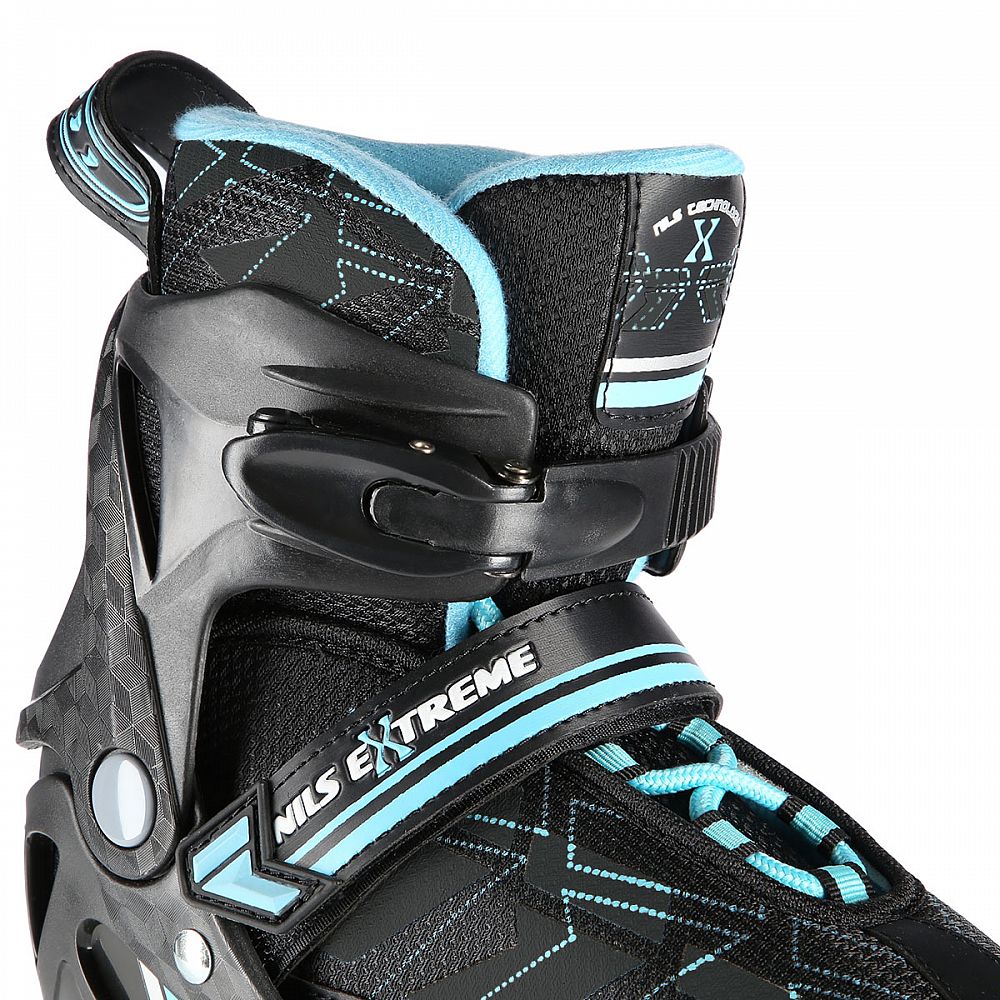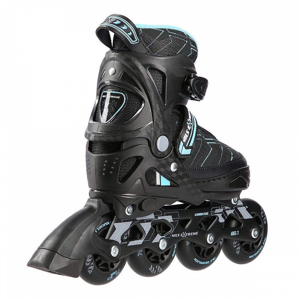 Kolieskové korčule NILS Extreme NA11002 sú určené na rekreačnú jazdu začínajúcich a mierne pokročilých korčuliarov po rovných a hladkých chodníkoch, ako napríklad po asfalte. Ľahká a odolná topánka zaisťuje bezpečnosť pri jazde. Systém ventilácie a tvarovaná stielka topánky priamo ovplyvňujú zvýšenie užívateľského komfortu. Ide o model s nastaviteľnou veľkosťou, kedy každá korčule má na výber zo 4 rozmerov. Pomocou jednoduchého riadiaceho systému je možné ľahko a rýchlo nastaviť veľkosť topánky na nohe užívateľa. Kolieska s tvrdosťou 82A sú uložené v hliníkovej lište, dobre priliehajú k podkladu a čiastočne pohlcujú nerovnosti. Model NA11002 je osadený ložiskami ABEC 7, ktoré sa vyznačujú precíznym spracovaním a nízkym odporom, kedy jazda má dobrú zotrvačnosť a na korčuliach tak možno uraziť dlhú vzdialenosť bez vynaloženia zbytočnej sily.