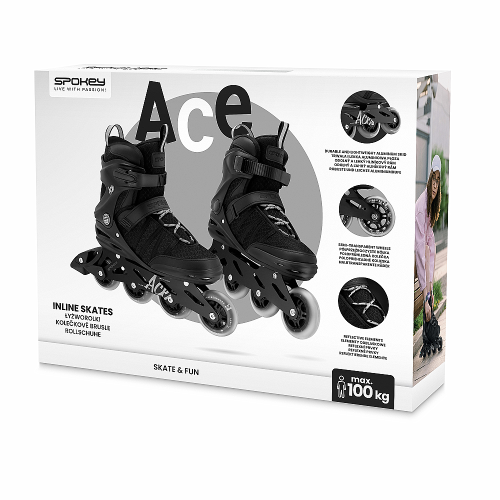 Fitness korčule Spokey ACE boli navrhnuté s ohľadom na rekreačnú jazdu, pričom kombinujú moderný, minimalistický dizajn s vysokou funkčnosťou. Ich semi-soft topánka poskytuje komfort a adekvátne odvetrávanie. Odolný hliníkový rám zaručuje stabilitu a ľahkosť celej konštrukcie.