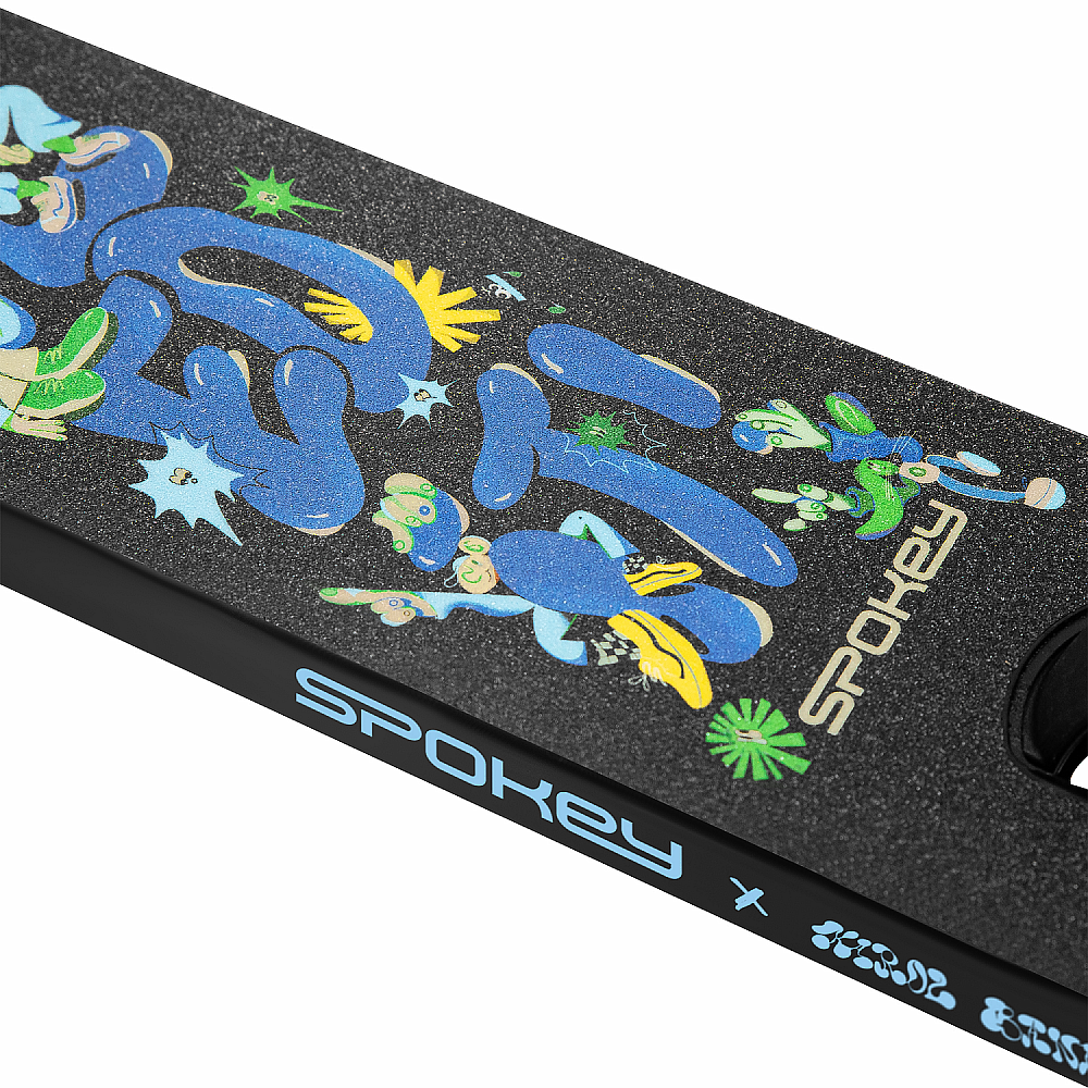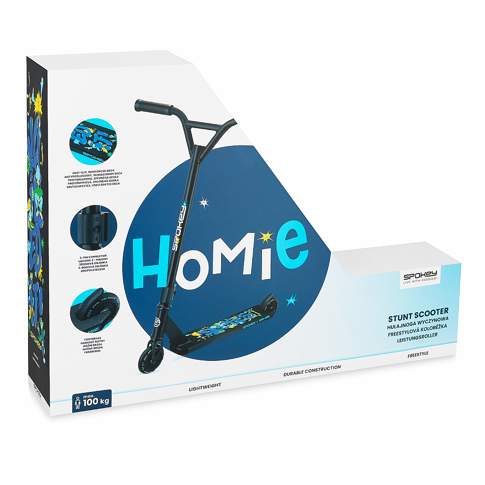Freestyle kolobežka Spokey HOMIE je ideálnou voľbou pre začiatočníkov, ktorí sa chcú pustiť do freestyle jazdenia. Odolná, ľahká konštrukcia a unikátny dizajn od Karola Banacha, s nápisom „Nailed it“ zakomponovaným do tvaru nášľapnej desky, z neho robia nielen praktickú, ale aj štýlovú voľbu.