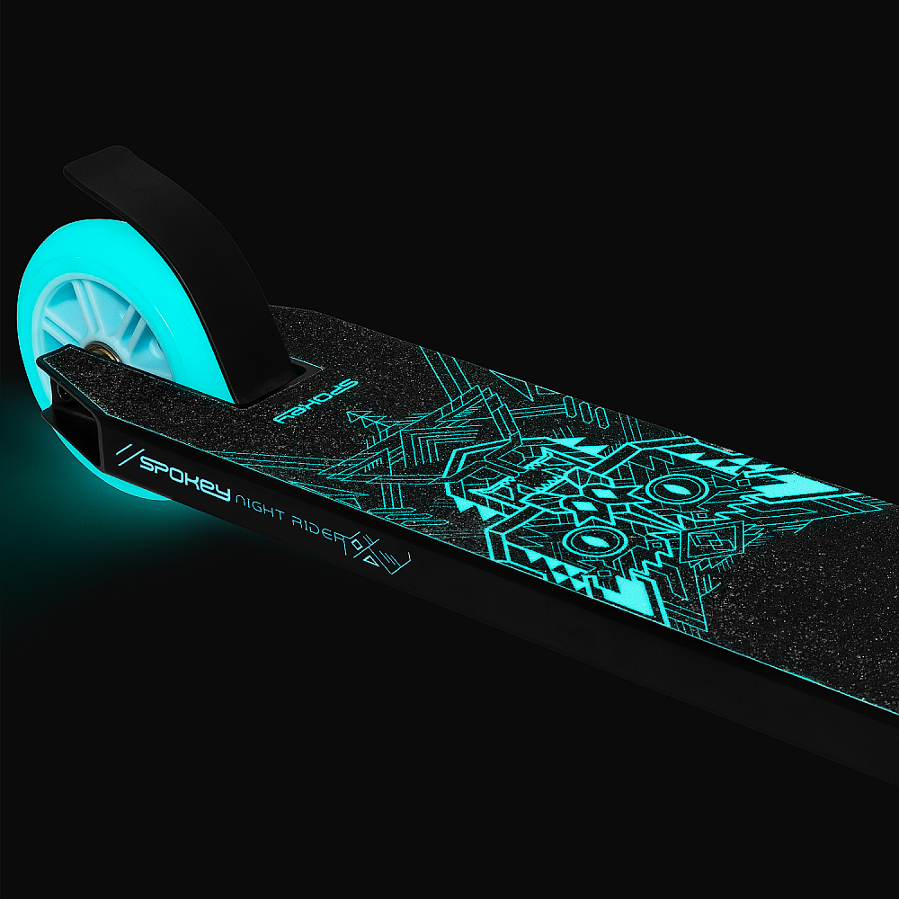 Freestyle kolobežka Spokey Night Rider je ideálnou voľbou pre začínajúcich a stredne pokročilých jazdcov. Vyznačuje sa zosilnenou konštrukciou a zároveň nízkou hmotnosťou. Protišmyková nášľapná doska s fosforeskujúcim povrchom, ktorý svieti v tme, zaisťuje nielen štýl, ale aj lepšiu viditeľnosť pri jazde.