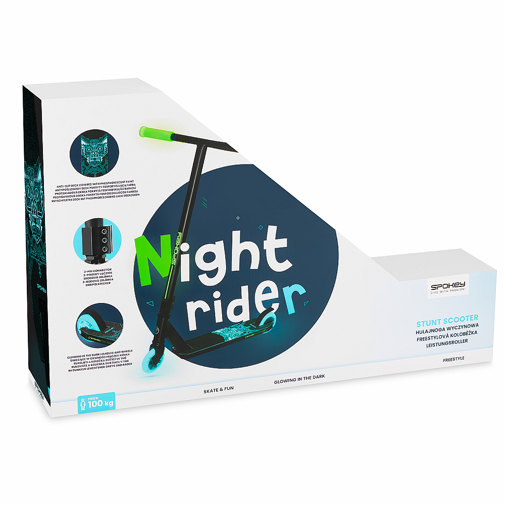 Kolobežka Night Rider je navrhnutá pre začínajúcich a stredne pokročilých freestyle jazdcov, ktorí ocenia štýl, kvalitu a funkčnosť. Zosilnená konštrukcia z hliníka a ocele zaisťuje odolnosť a zároveň nízku hmotnosť - kolobežka váži iba 3,6 kg. Nášľapná doska a rukoväte s fosforeskujúcou farbou nielen skvele vyzerajú, ale taktiež zvyšujú viditeľnosť pri jazde za zníženej viditeľnosti.