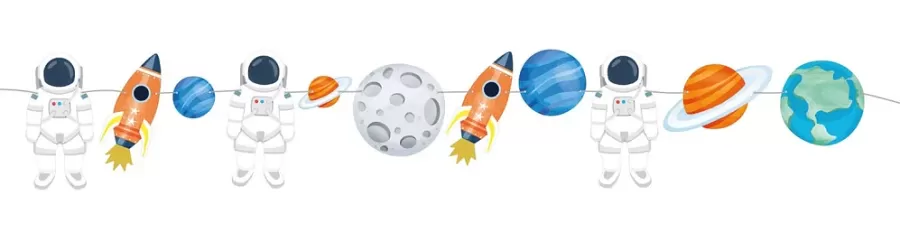 Papierová girlanda vo vesmírnom motíve s planétami, raketami a postavičkami astronautov. Girlanda, ktorá sa hodí na oslavu všetkých nadšencov do vesmírnej tematiky. Ideálne môžete skombinovať s ďalšími produktmi ako sú naše vesmírne zápichy do muffinov alebo sada vesmírnych balónikov.