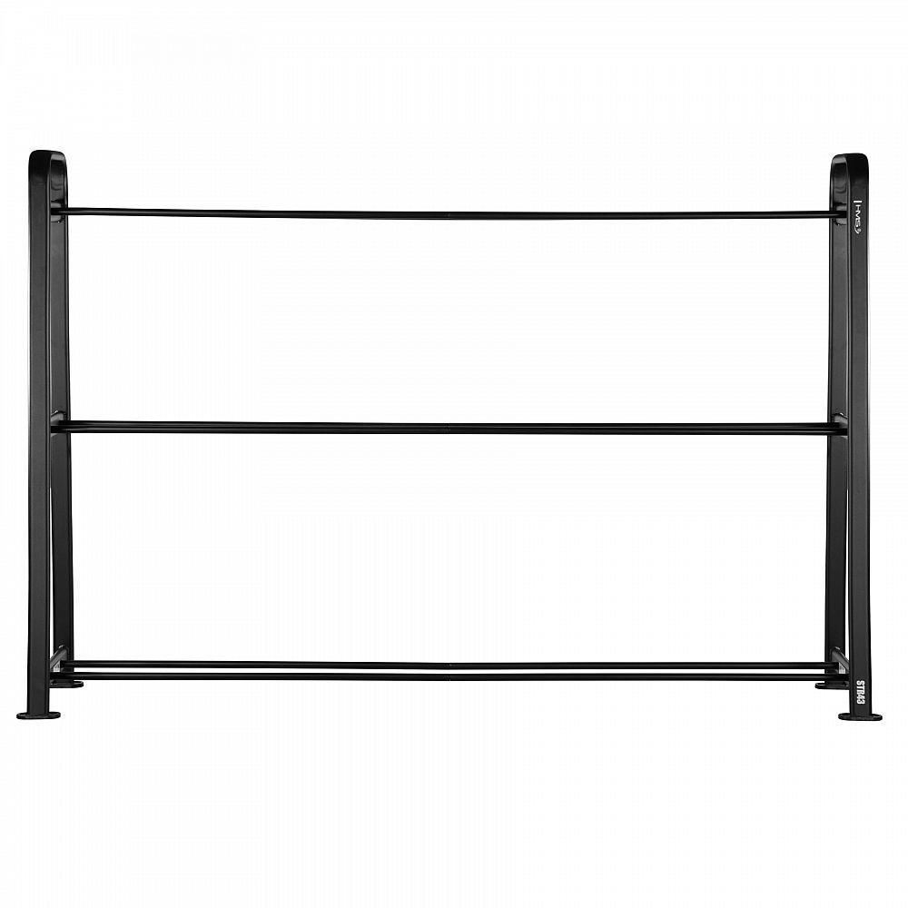 Stojan STR43 s tromi úrovňami uloženia umožňuje prehľadné rozdelenie lôpt podľa veľkosti a farby. Na spodnej polici sú uložené čierne lopty, uprostred fialovej a na hornej polici grafitovej, čo nielen uľahčuje prístup k vybaveniu, ale taktiež dodáva tréningovému priestoru moderný a profesionálny vzhľad.